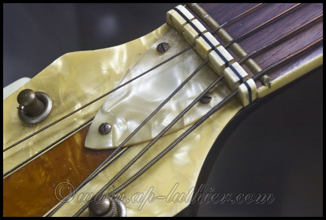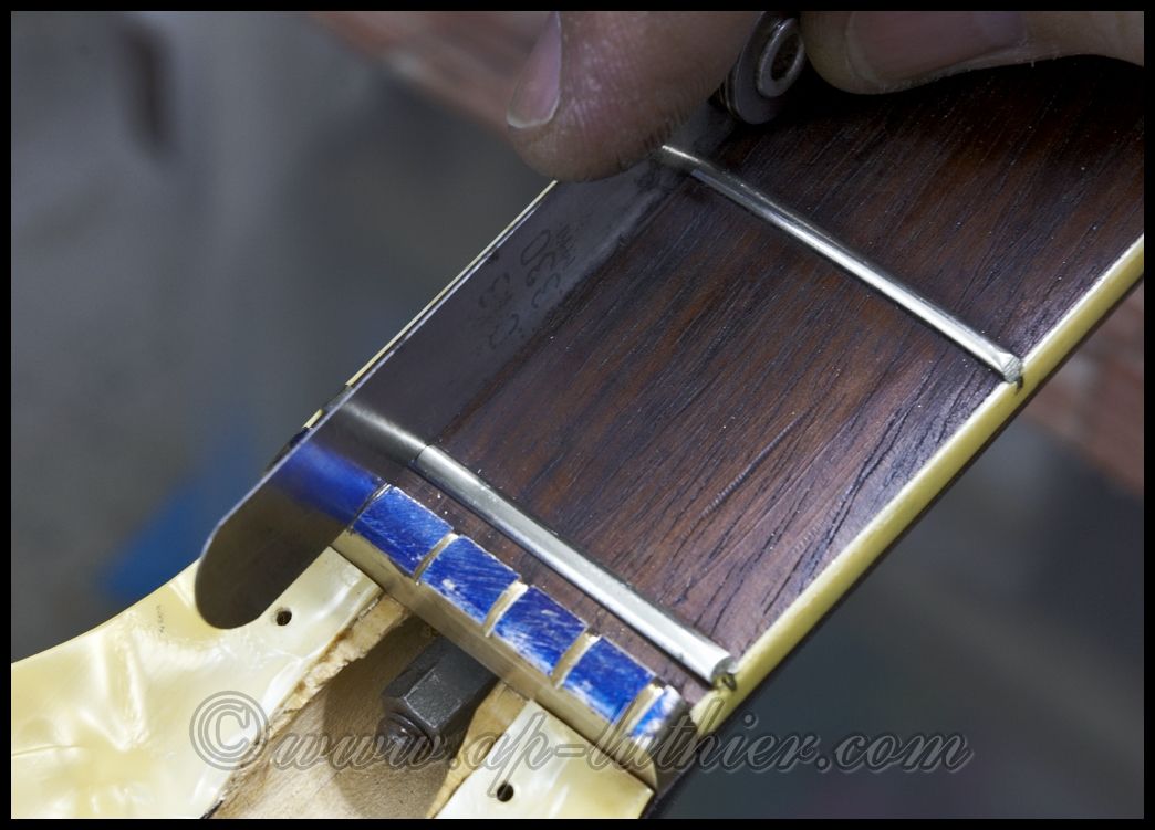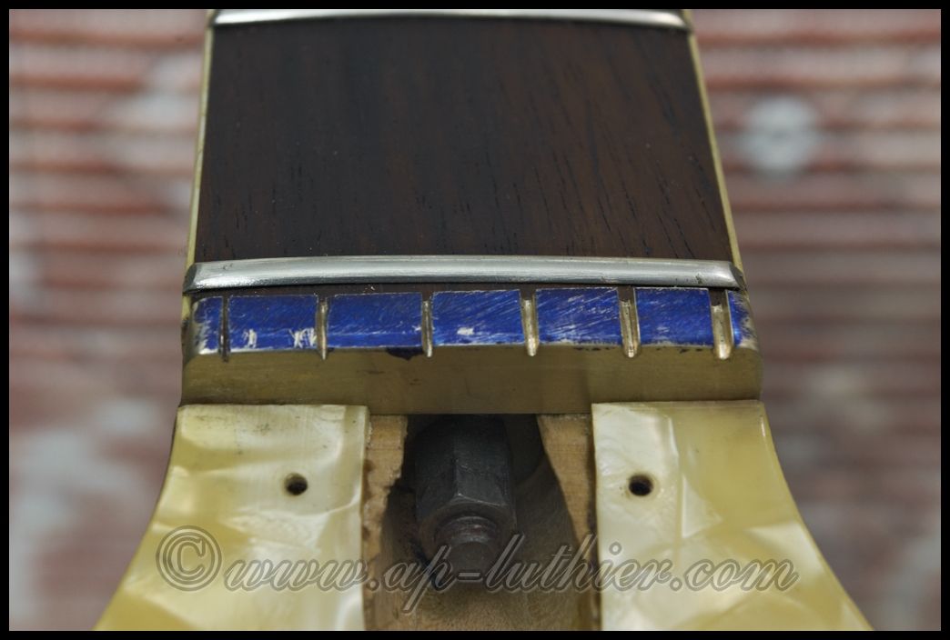 antigua marca Hofner Aquí les presento la reconstrucción y sustitución de una cejuela, en una guitarra antigua, en donde se puede observar lo mal diseñada y en el mal estado en el que se encuentra. Si quieren ver la guitarra pinchen Aquí ![]() Extraída de su base se puede apreciar mejor su estado. ![]() En ambos lados presenta un estado lamentable. ![]() La nueva cejuela fue hecha en Bronce. Este bronce es bastante especial por reunir características acústicas. No todas las aleaciones son indicadas para instrumentos musicales. ![]() Poco a poco va tomando forma. Observen como está compensada para que el eje de cada cuerda se encuentre exactamente equidistante una de otra. ![]() Antes de darle los remates finales y pulirla, ya se aprecia la GRAN diferencia de la nueva con respecto a la anterior. ![]() Pulida, solo resta instalarla en su sitio, ![]() y así queda en la guitarra. ![]() Un saludo a Todo@s |