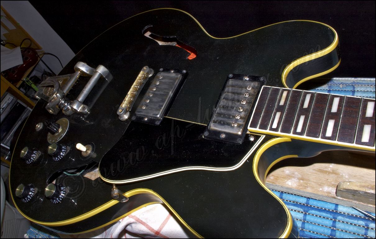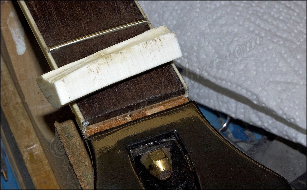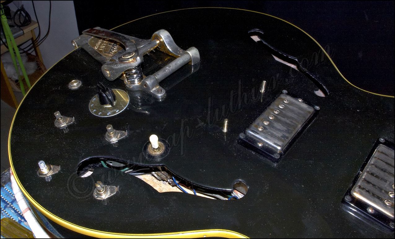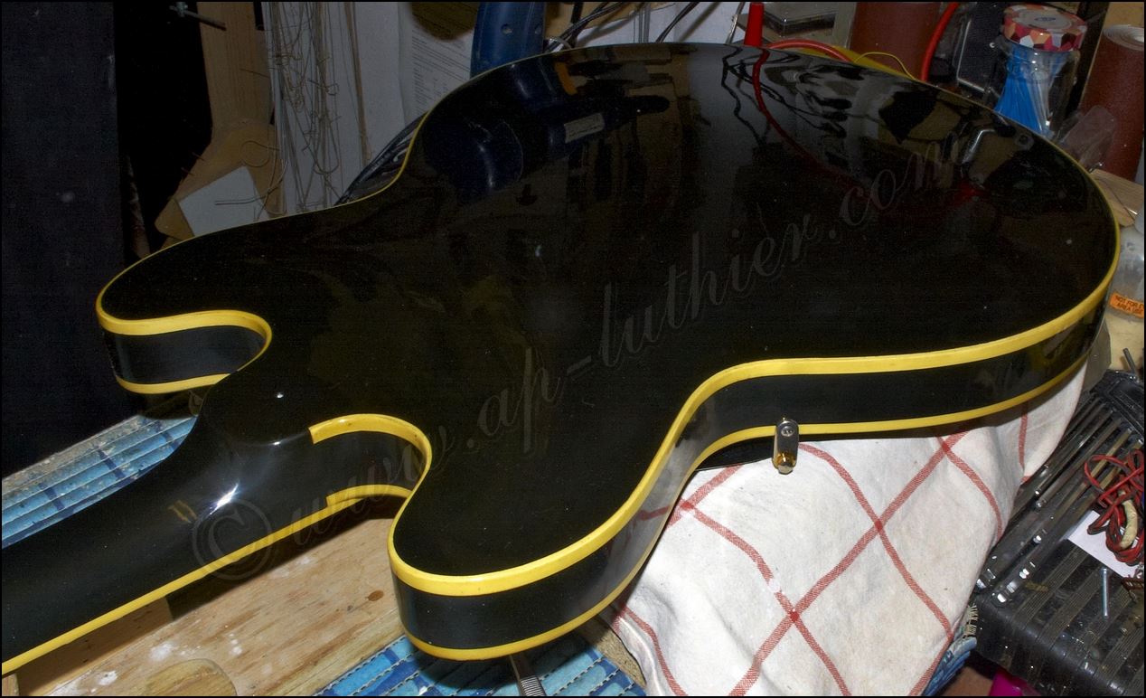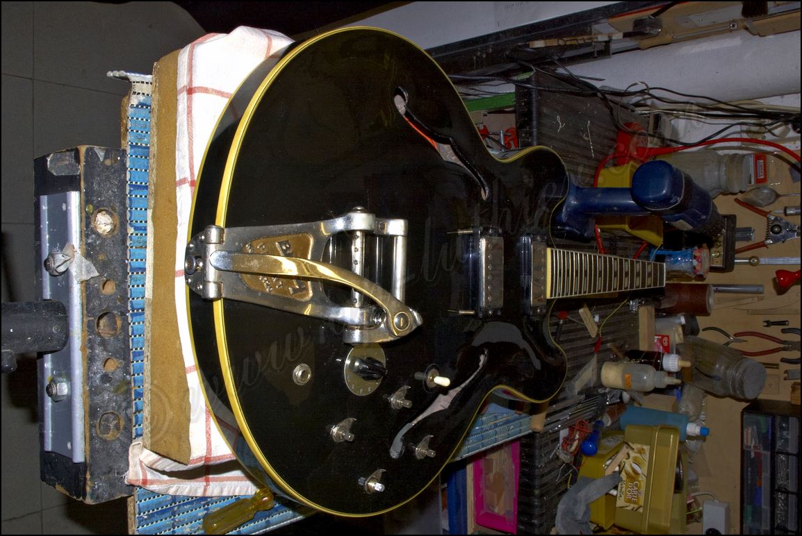 Desastre en una Gibson original ES-345 de 1961 Bueno, una vez arreglada la electrónica viene el proceso de introducir las piezas. ![]() Poco a poco y con paciencia las cosas van cuadrando en su sitio ![]() Hasta que al final todo queda montado y funcionando. ![]() Ahora voy con los detalles. Ya envejecí algunos elementos como los logos, el binding y los inlays. El golpeador como se puede ver lo han destrozado con ese corte, además de que no se quien lo hizo, pero debe tener mal el calibrador.... No queda mas remedio que hacer uno nuevo. ![]() Detalle de lo que cortaron ![]() Detalle de la distancia a las pastillas ![]() Detalle de las curvas en los marcos de las pastillas. Esto no es original ![]() Comienzo con preforma con la cual elaboro ![]() la plantilla ![]() Y a su vez con esta elaboro el nuevo golpeador ![]() A falta de pulirlo ya se ve como cuadra bien en todos sitios. ![]() Una vez terminado, lo envejezco para que no desentone con el otro. Como pueden ver esta hecho a partir de una lámina pentacapa, con el blanco inferior mas ancho que el superior, que se utilizaba mucho en esas fechas. Lamentablemente no tiene las medidas exactas del original en los espesores, ya que solo lo fabrican en Japón y con estas dimensiones, y aunque se ve en varios sitios, todos provienen del mismo fabricante. Pero bueno por lo menos respetamos la idea original, ya que un pentacapa con las capas iguales cantaba mas. ![]() Ahora voy tallando la cejuela de hueso de Toro. El proceso lo he mostrado varias veces, así que me parece un poco repetitivo, así que el que lo quiera consultar que revise mi página. Aquí les muestro el cacho de hueso a usar. ![]() Uno de los horrores, porque es mas que un error, fue como he dicho antes taparle la seña de identidad a la guitarra. He hecho esta lo mas parecido a la original. ![]() Y aquí ya puesta en su sitio ![]() Bigsby en su sitio ![]() Los soportes del puente como deben ir, limpios y sin chorretones de acabado. ![]() Poco a poco va llegando a su fin ![]() A falta de bakelita que es el material original para el soporte del golpeador, pues lo he sustituido con un cachito de ébano, espero que la CITES no ande por ahí... ![]() Golpeador en su sitio ![]() Vista de la parte trasera de la guitarra ![]() Página Anterior Página Siguiente |