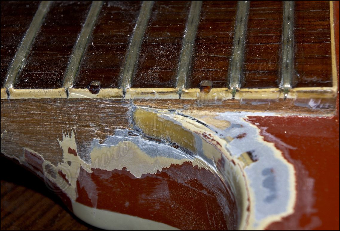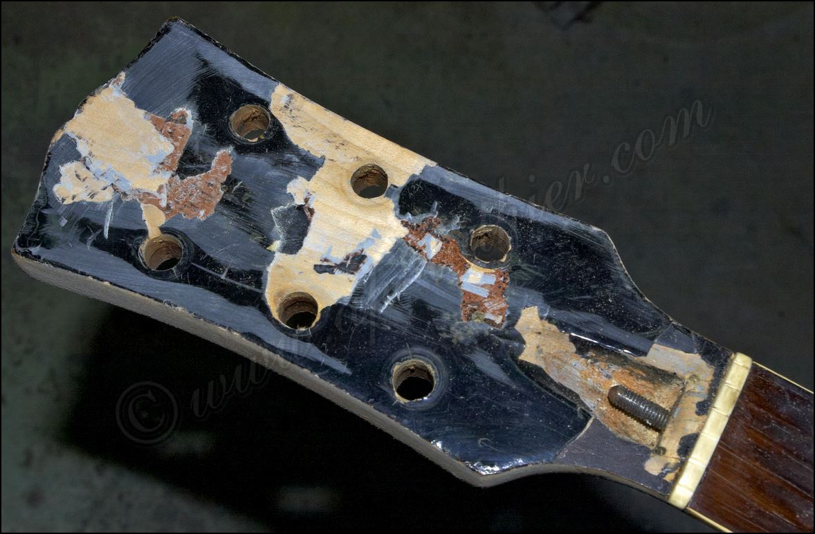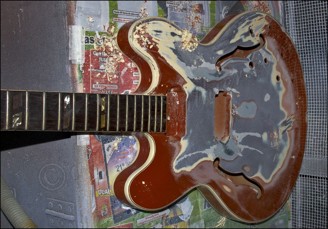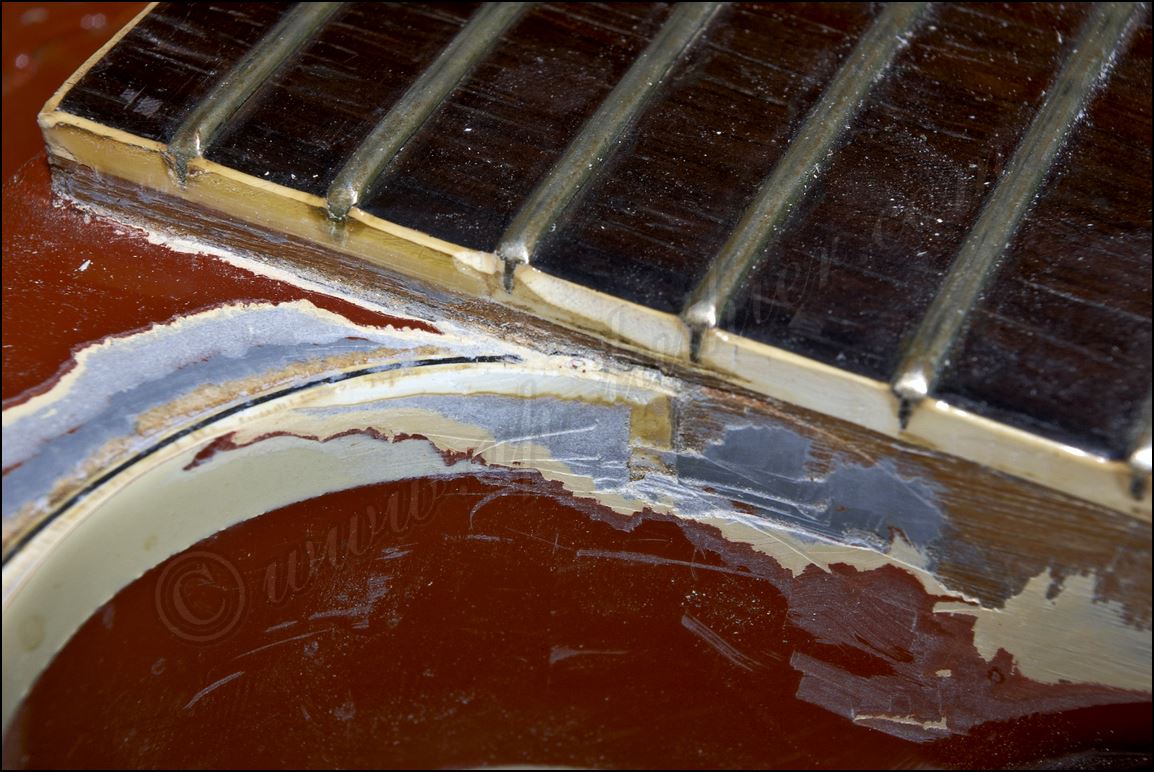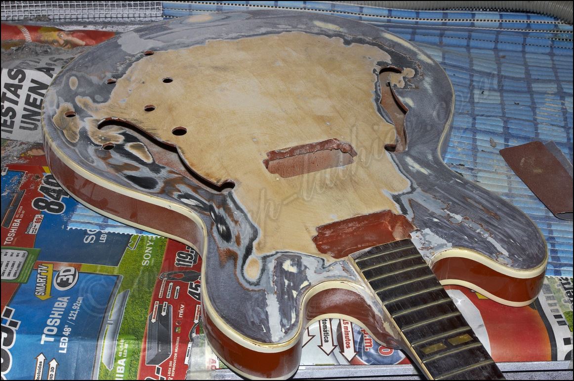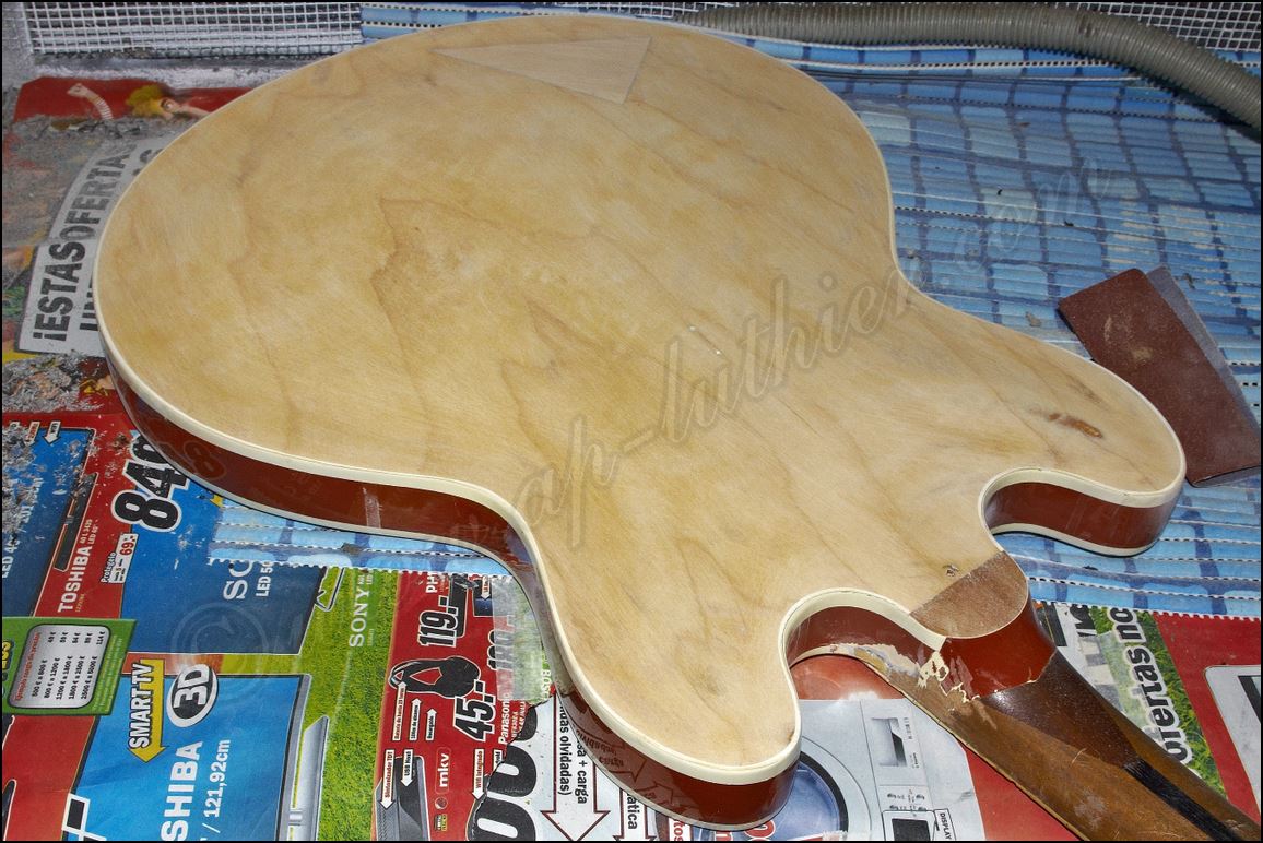 Desastre en una Gibson original ES-345 de 1961 He aquí todos los inlays cortados y me dispongo a insertarlos en sus respectivos orificios ![]() Listo solo falta igualar la superficie ![]() He tintado la tapa de negro y ya he cortado el logo y la corona ![]() Y aquí están insertados ![]() Aqui si hay mier..., perdón pintura. Me está costando un montón raspar todo ese acabado ![]() Poco a poco sale el binding original ![]() He tapado el hueco con una pieza de arce y he procurado que todas las vetas se crucen para reforzar mas la zona. ![]() Menos mal que el binding original todavía está ahí, pero el mástil se ve que no es el original. Que habrá pasado. ![]() Igual en el otro lado. ![]() Despues de tanto lijar, raspar y maldecir, pues ya comienzo a ver la tapa ![]() Son capas y capas de acabado ![]() Por fin se ve la tapa trasera ![]() Aqui ya he reparado la rotura y se puede ver que las dimensiones no corresponden con el modelo. ![]() Sigo con la delantera ![]() La tapa de la pala es de arce lo que denota que está modificada ![]() Mucho desperdicio en cuanto al acabado ![]() Aquí se aprecia un injerto de cedro. ![]() Aquí en la "F" pueden observar las 9 capas de pintura que se le aplicaron, con lo que en la superficie este grosor era mas del triple. ![]() Igual en el resto de la superficie ![]() ![]() Las "F" lucen como deberían sin el acabado ![]() Página Anterior Página Siguiente |