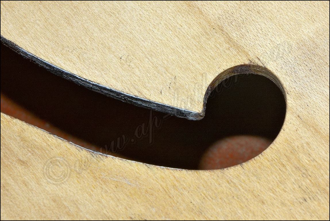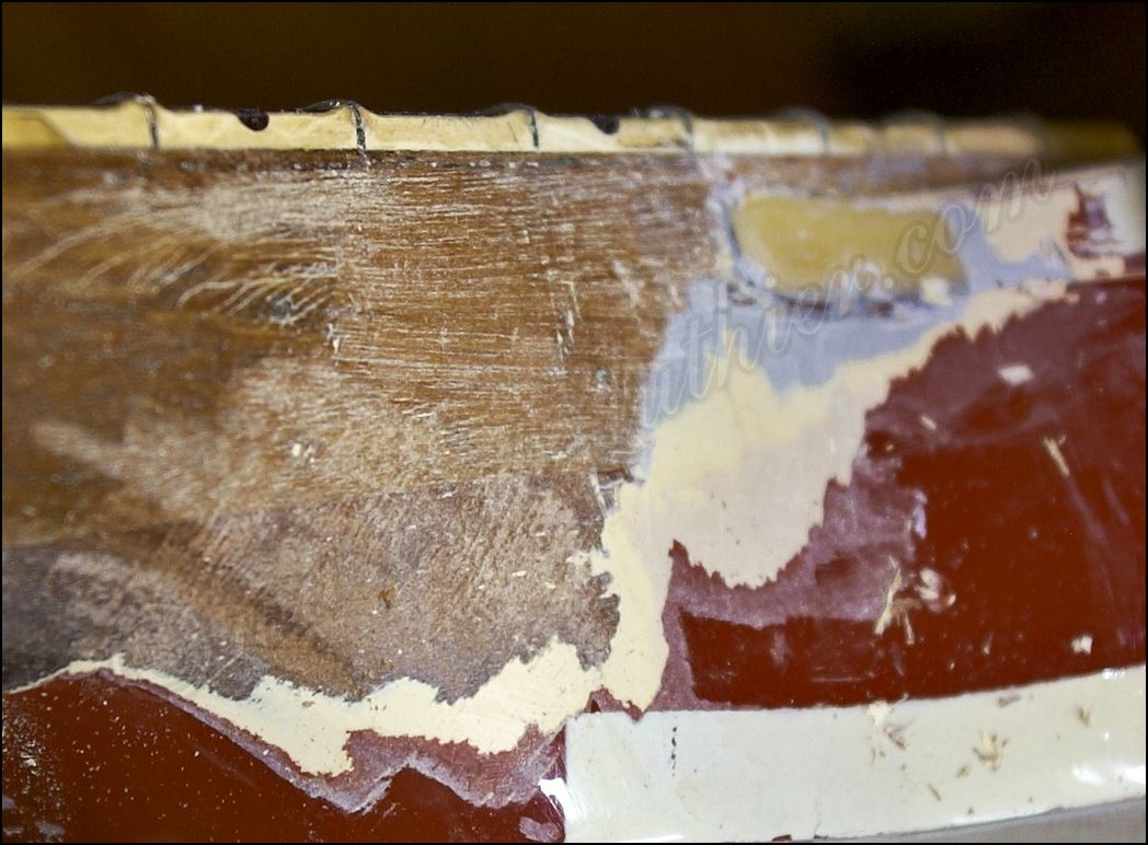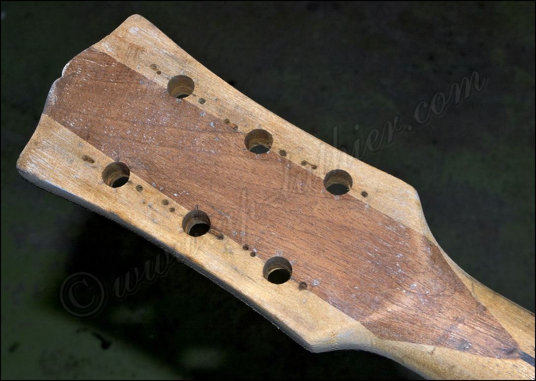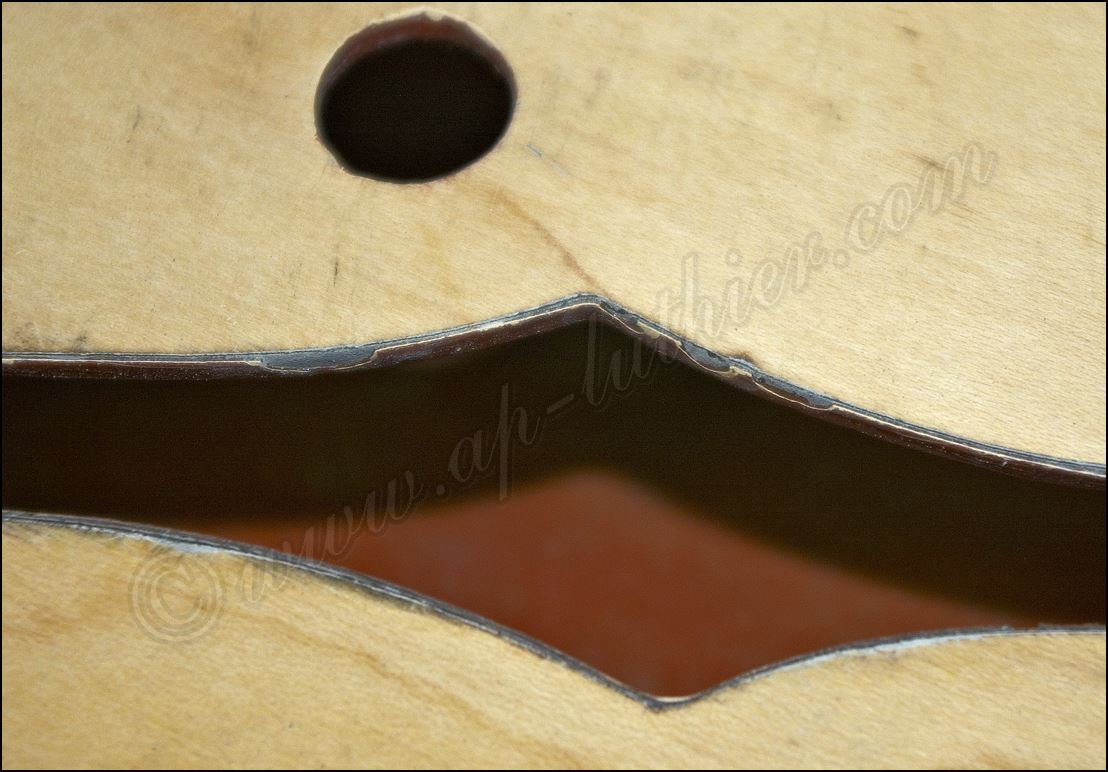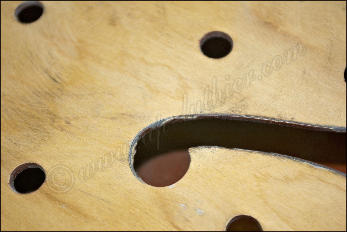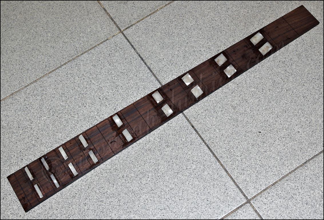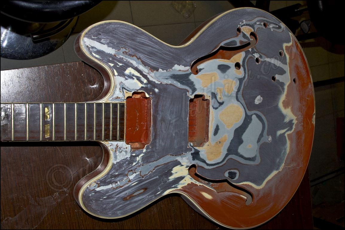 Desastre en una Gibson original ES-345 de 1961 He aquí todos los inlays cortados y me dispongo a insertarlos en sus respectivos orificios ![]() Listo solo falta igualar la superficie ![]() He tintado la tapa de negro y ya he cortado el logo y la corona ![]() Y aquí están insertados ![]() Aqui si hay mier..., perdón pintura. Me está costando un montón raspar todo ese acabado ![]() Poco a poco sale el binding original ![]() He tapado el hueco con una pieza de arce y he procurado que todas las vetas se crucen para reforzar mas la zona. ![]() Menos mal que el binding original todavía está ahí, pero el mástil se ve que no es el original. Que habrá pasado. ![]() Igual en el otro lado. ![]() Despues de tanto lijar, raspar y maldecir, pues ya comienzo a ver la tapa ![]() Son capas y capas de acabado ![]() Por fin se ve la tapa trasera ![]() Aqui ya he reparado la rotura y se puede ver que las dimensiones no corresponden con el modelo. ![]() Sigo con la delantera ![]() La tapa de la pala es de arce lo que denota que está modificada ![]() Mucho desperdicio en cuanto al acabado ![]() Aquí se aprecia un injerto de cedro. ![]() Aquí en la "F" pueden observar las 9 capas de pintura que se le aplicaron, con lo que en la superficie este grosor era mas del triple. ![]() Igual en el resto de la superficie ![]() ![]() Las "F" lucen como deberían sin el acabado ![]() Página Anterior Página Siguiente |