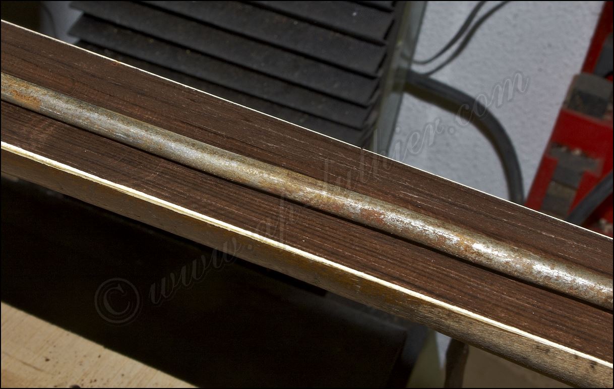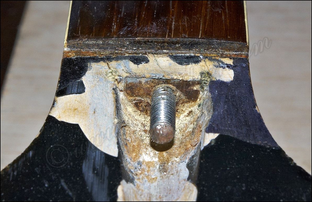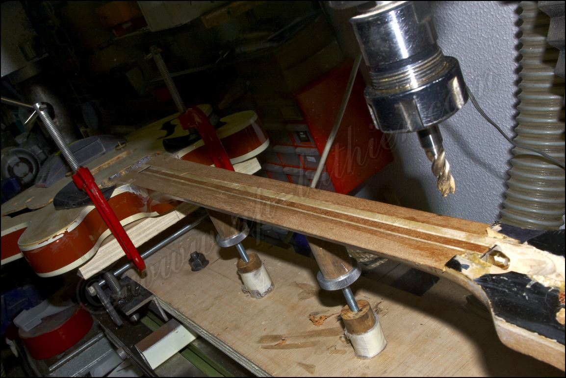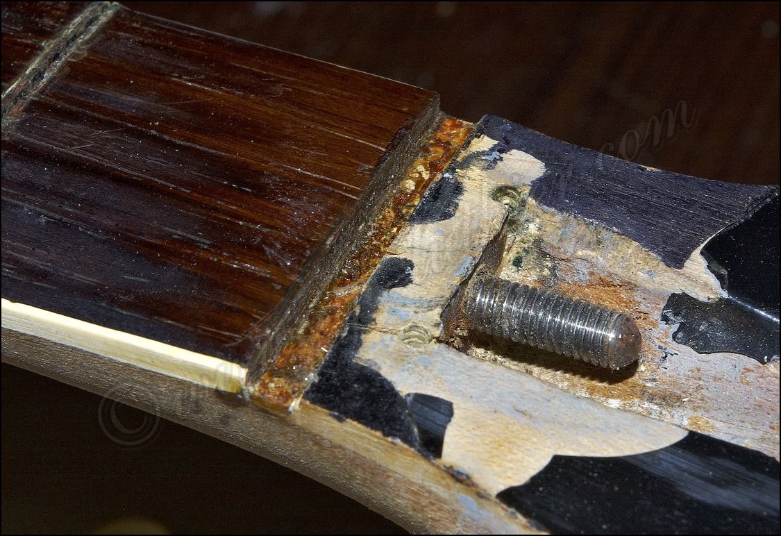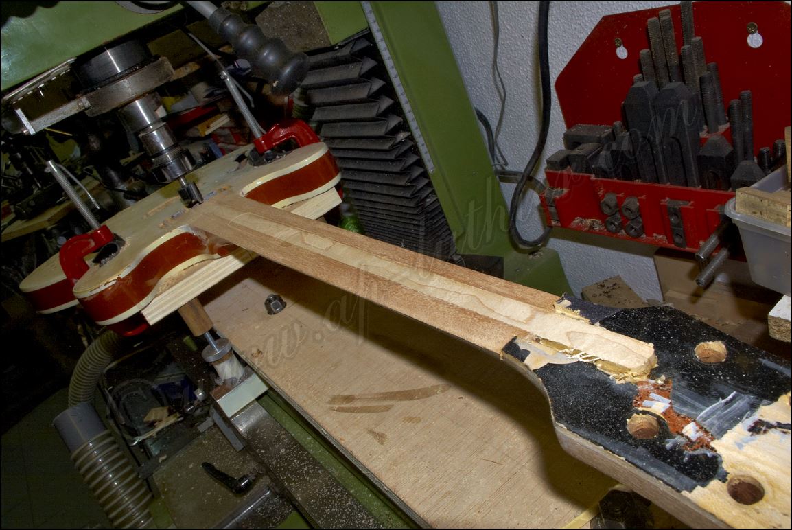 Desastre en una Gibson original ES-345 de 1961 Por fin acabé de despejar la tapa ![]() Ahora voy con las otras sorpresas a ver que ocultan. ![]() En la cejuela me encuentro un trozo de madera con un pegoste indescriptible ![]() Tanto costaría hacerle una cejuela nueva, en vez de entrampar la vieja que ni siquiera es la original. ![]() Detalle del alma. Lo descentrado y con fracturas en la madera que dan muy mala espina ![]() No queda mas remedio que eliminar el diapasón a ver que hay. intenté con calor como es lógico, pero se conoce que lo encoló con epoxi, y esto el calor no le hace nada. ![]() Aquí está otro error gravísimo. Esta alma no es funcional. Esto gira y no ajusta la guitarra, de ahí que tuviese que rebajar tanto el diapasón para llegar a no trastear o por lo menos trastear lo menos posible. Lo que no entiendo es para que le cambió el alma, si la rotura de la pala no tiene nada que ver. Eso se repara sin tocar el alma. En fin... ![]() Luego veo esa tablita que le colocó a mayores para tapar el estropicio del surco del alma ![]() Otro ángulo donde se puede ver lo irregular del surco. ![]() El alma la saque tirando de ella después ![]() de cortarle las tuercas que estaban gripadas en el eje. ![]() Termino de fresar y SORPRESA. En vez de un listón para el alma, le ha puesto trocitos de madera de pino de esa que hay en los pales de transporte. El madrileño la verdad es que no pega una. ![]() Aquí probando las medidas de como queda el nuevo diapasón ![]() Y aquí lo que tuve que rebajar para sanear toda la zona del alma y poder hacerla derecha ![]() Le puse una pieza de arce para compensar la debilidad de la otra madera. ![]() Centrada la guitarra, me dispongo a hacerle el surco del alma ![]() Listo y en su sitio como debe ser, y con la forma, aspecto y el ángulo original ![]() Igual atrás pero esta vez no hay problemas con que no ajuste. ![]() Como queda en el centro del mástil. Esta alma es de acero inoxidable, para evitar problemas mayores. ![]() Lista el alma con su tapa de caoba de Honduras. ![]() Página Anterior Página Siguiente |