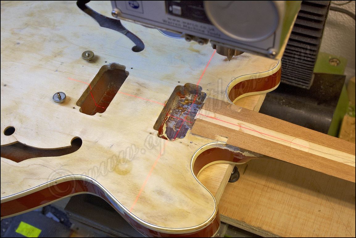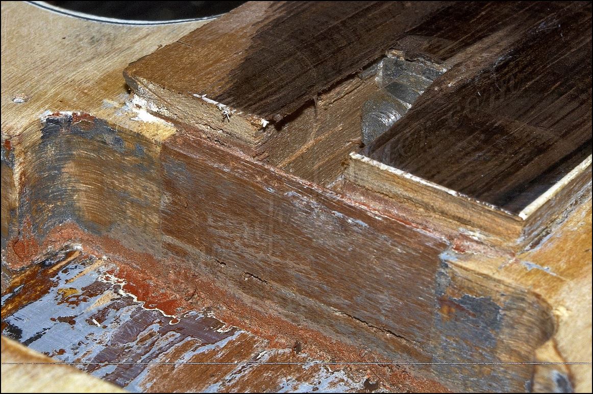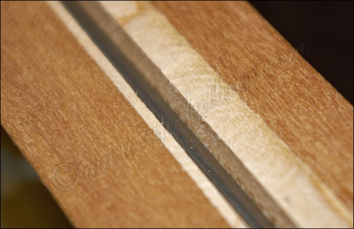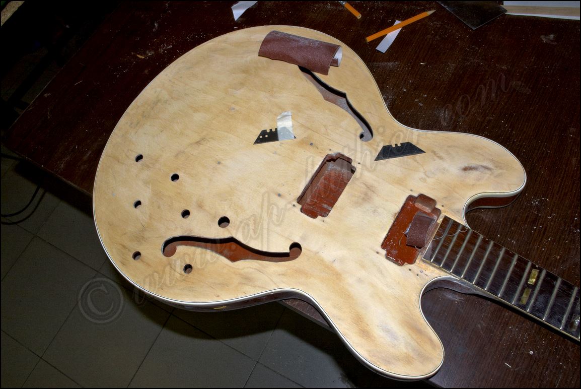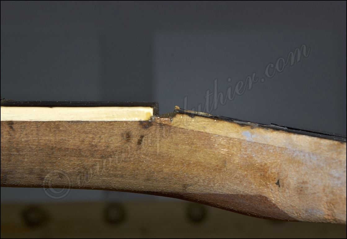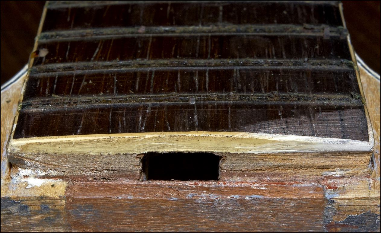 Desastre en una Gibson original ES-345 de 1961 Por fin acabé de despejar la tapa ![]() Ahora voy con las otras sorpresas a ver que ocultan. ![]() En la cejuela me encuentro un trozo de madera con un pegoste indescriptible ![]() Tanto costaría hacerle una cejuela nueva, en vez de entrampar la vieja que ni siquiera es la original. ![]() Detalle del alma. Lo descentrado y con fracturas en la madera que dan muy mala espina ![]() No queda mas remedio que eliminar el diapasón a ver que hay. intenté con calor como es lógico, pero se conoce que lo encoló con epoxi, y esto el calor no le hace nada. ![]() Aquí está otro error gravísimo. Esta alma no es funcional. Esto gira y no ajusta la guitarra, de ahí que tuviese que rebajar tanto el diapasón para llegar a no trastear o por lo menos trastear lo menos posible. Lo que no entiendo es para que le cambió el alma, si la rotura de la pala no tiene nada que ver. Eso se repara sin tocar el alma. En fin... ![]() Luego veo esa tablita que le colocó a mayores para tapar el estropicio del surco del alma ![]() Otro ángulo donde se puede ver lo irregular del surco. ![]() El alma la saque tirando de ella después ![]() de cortarle las tuercas que estaban gripadas en el eje. ![]() Termino de fresar y SORPRESA. En vez de un listón para el alma, le ha puesto trocitos de madera de pino de esa que hay en los pales de transporte. El madrileño la verdad es que no pega una. ![]() Aquí probando las medidas de como queda el nuevo diapasón ![]() Y aquí lo que tuve que rebajar para sanear toda la zona del alma y poder hacerla derecha ![]() Le puse una pieza de arce para compensar la debilidad de la otra madera. ![]() Centrada la guitarra, me dispongo a hacerle el surco del alma ![]() Listo y en su sitio como debe ser, y con la forma, aspecto y el ángulo original ![]() Igual atrás pero esta vez no hay problemas con que no ajuste. ![]() Como queda en el centro del mástil. Esta alma es de acero inoxidable, para evitar problemas mayores. ![]() Lista el alma con su tapa de caoba de Honduras. ![]() Página Anterior Página Siguiente |