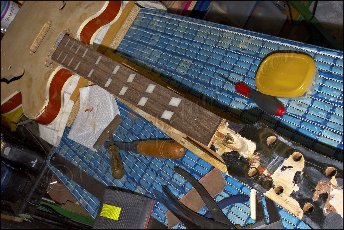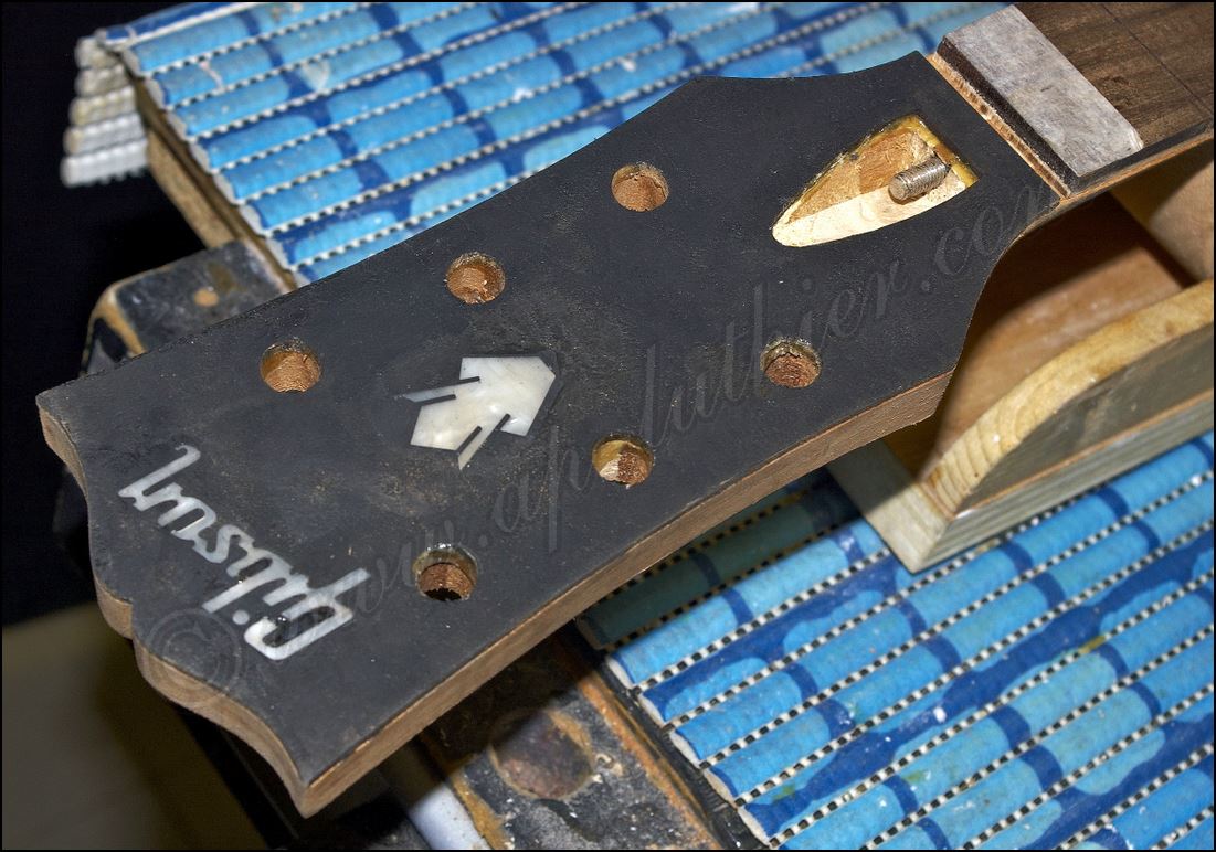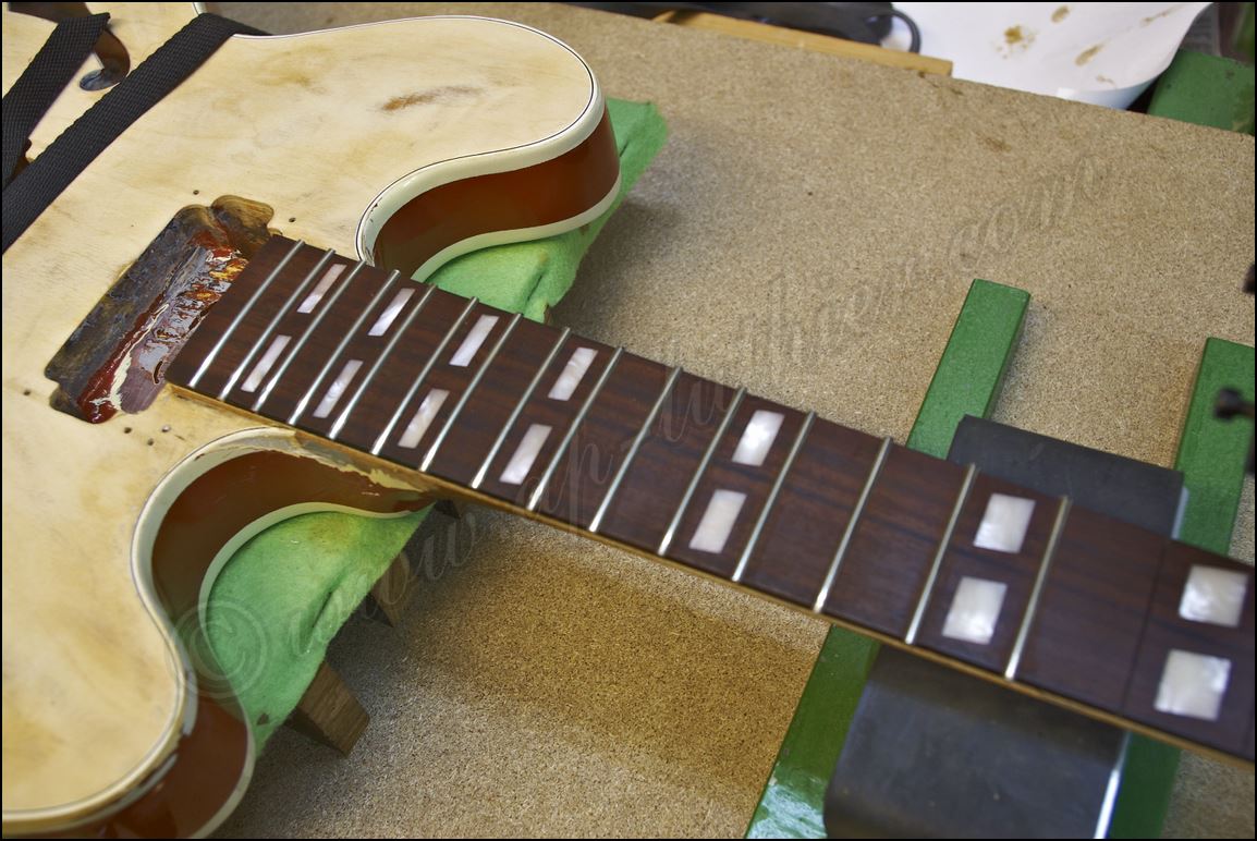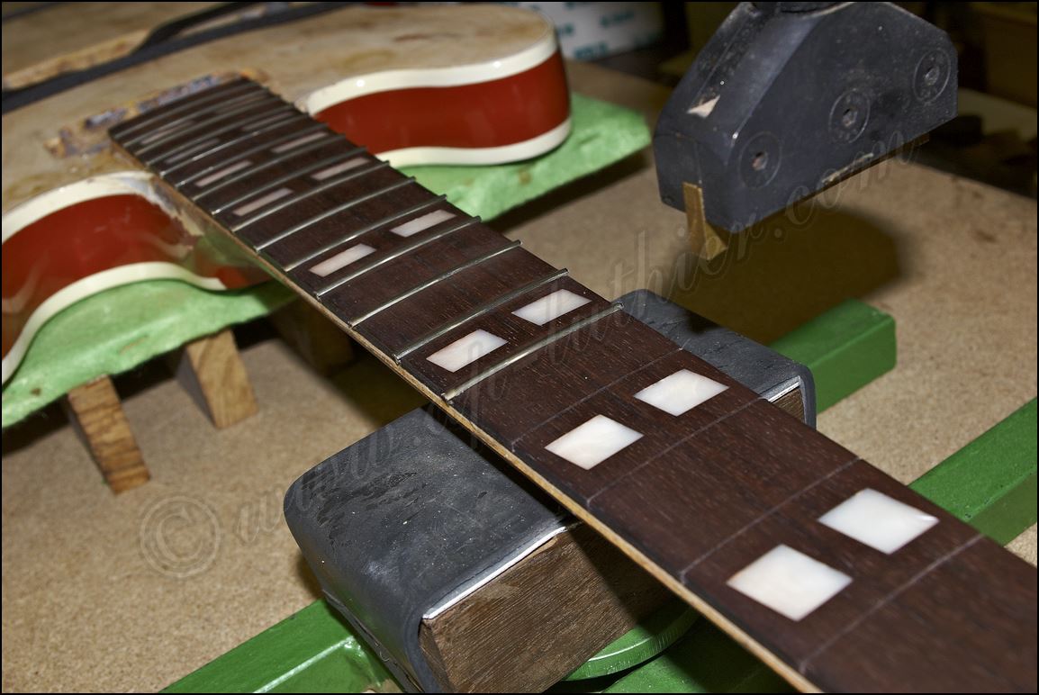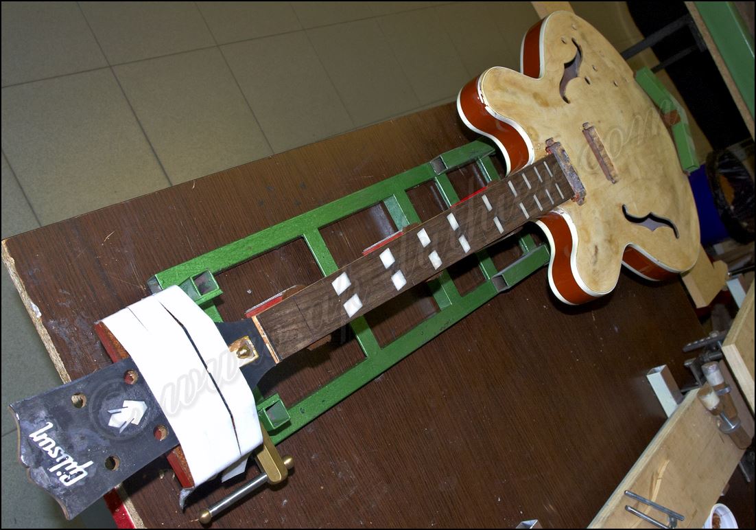 Desastre en una Gibson original ES-345 de 1961 Le hago el surco del alma y paso a la pala ![]() Va cogiendo forma. Ustedes se preguntarán, y no saldría mejor hacerle un mástil nuevo? Pues se lo consulté al dueño, pero prefirió no hacerlo. Y eso hay que respetarlo. ![]() Le pego dos refuerzos de caoba de Honduras como era originalmente ![]() Con distinto ángulo para que me de chance a rectificar la posición original. ![]() Cuadro la tapa que hice con anterioridad ![]() Y freso alrededor de ella ![]() Ahora si se va pareciendo a una Gibson ![]() Igual atrás. Observen donde estaban los huecos anteriores completamente desfazados ![]() El perfil ahora es Gibson 100% ![]() Al igual que su aspecto general ![]() A continuación encolo el diapasón al mástil y lo coloco en una armazón creada por mi para darle el radio de curvatura ![]() Poco a poco se le va dando el radio adecuado que en este caso es de 12" ![]() Y listo ![]() El diapasón está listo para recibir los trastes ![]() ![]() Procedo a entrastar ![]() ![]() ![]() Página Anterior Página Siguiente |