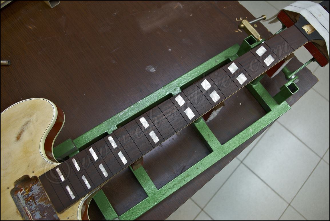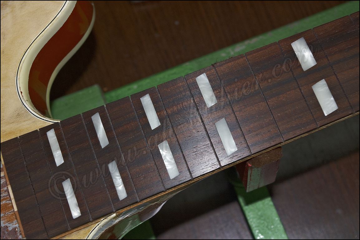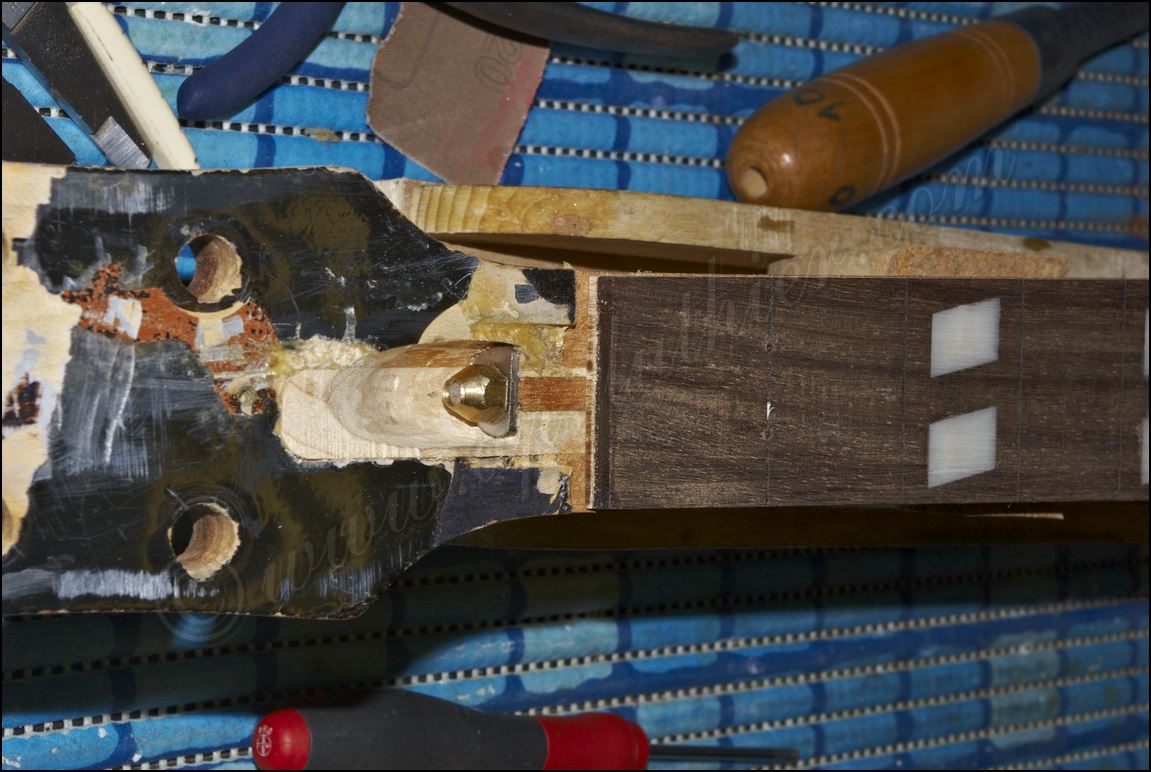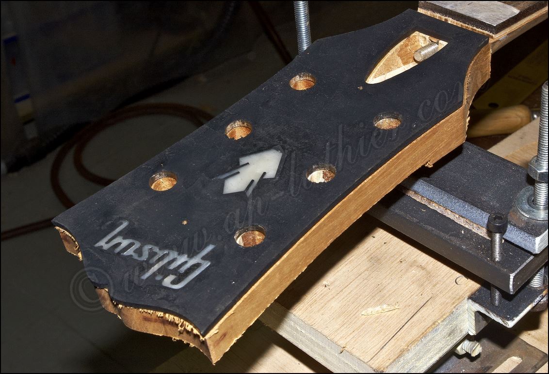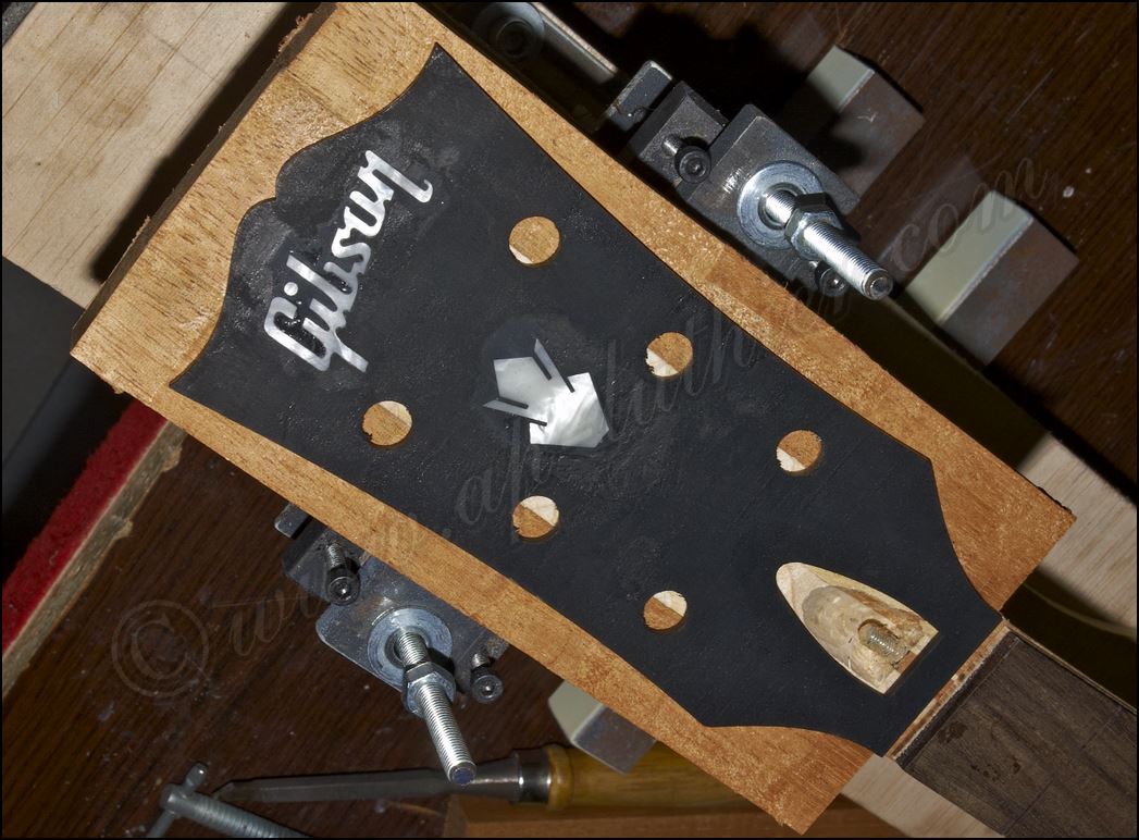 Desastre en una Gibson original ES-345 de 1961 Le hago el surco del alma y paso a la pala ![]() Va cogiendo forma. Ustedes se preguntarán, y no saldría mejor hacerle un mástil nuevo? Pues se lo consulté al dueño, pero prefirió no hacerlo. Y eso hay que respetarlo. ![]() Le pego dos refuerzos de caoba de Honduras como era originalmente ![]() Con distinto ángulo para que me de chance a rectificar la posición original. ![]() Cuadro la tapa que hice con anterioridad ![]() Y freso alrededor de ella ![]() Ahora si se va pareciendo a una Gibson ![]() Igual atrás. Observen donde estaban los huecos anteriores completamente desfazados ![]() El perfil ahora es Gibson 100% ![]() Al igual que su aspecto general ![]() A continuación encolo el diapasón al mástil y lo coloco en una armazón creada por mi para darle el radio de curvatura ![]() Poco a poco se le va dando el radio adecuado que en este caso es de 12" ![]() Y listo ![]() El diapasón está listo para recibir los trastes ![]() ![]() Procedo a entrastar ![]() ![]() ![]() Página Anterior Página Siguiente |