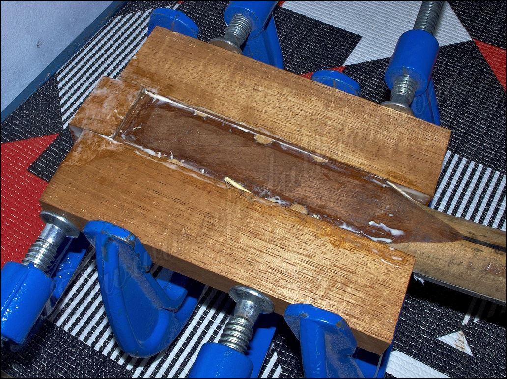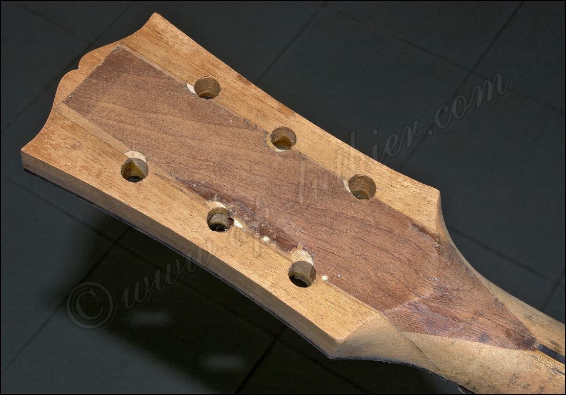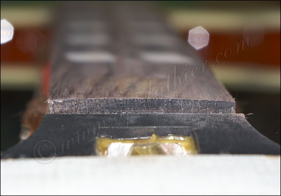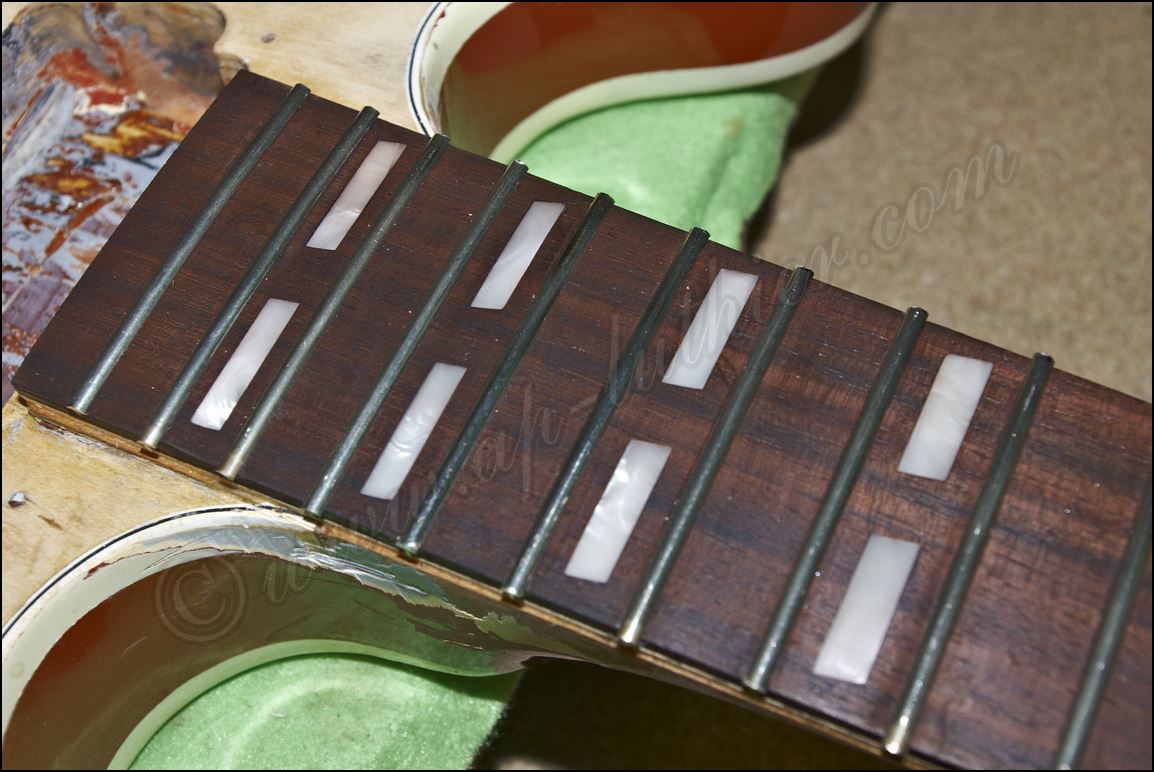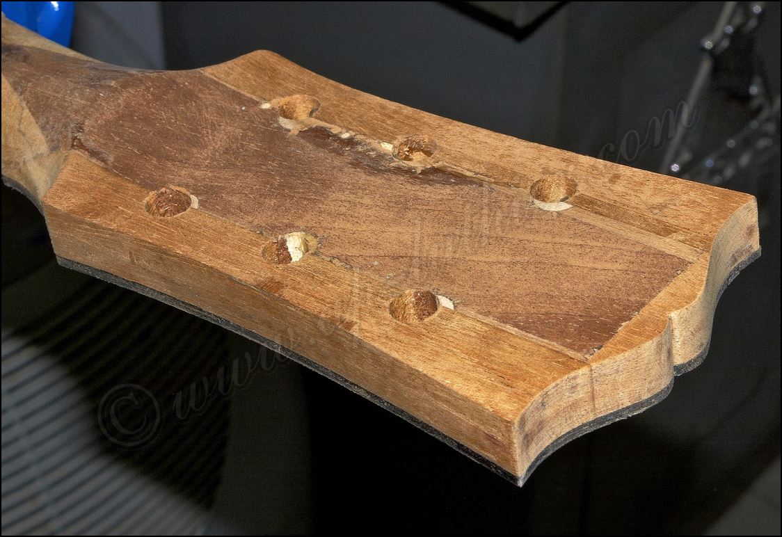Desastre en una Gibson original ES-345 de 1961 Le hago el surco del alma y paso a la pala ![]() Va cogiendo forma. Ustedes se preguntarán, y no saldría mejor hacerle un mástil nuevo? Pues se lo consulté al dueño, pero prefirió no hacerlo. Y eso hay que respetarlo. ![]() Le pego dos refuerzos de caoba de Honduras como era originalmente ![]() Con distinto ángulo para que me de chance a rectificar la posición original. ![]() Cuadro la tapa que hice con anterioridad ![]() Y freso alrededor de ella ![]() Ahora si se va pareciendo a una Gibson ![]() Igual atrás. Observen donde estaban los huecos anteriores completamente desfazados ![]() El perfil ahora es Gibson 100% ![]() Al igual que su aspecto general ![]() A continuación encolo el diapasón al mástil y lo coloco en una armazón creada por mi para darle el radio de curvatura ![]() Poco a poco se le va dando el radio adecuado que en este caso es de 12" ![]() Y listo ![]() El diapasón está listo para recibir los trastes ![]() ![]() Procedo a entrastar ![]() ![]() ![]() Página Anterior Página Siguiente |