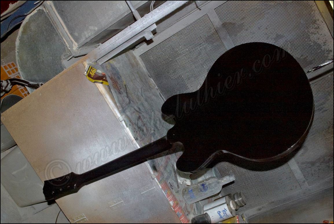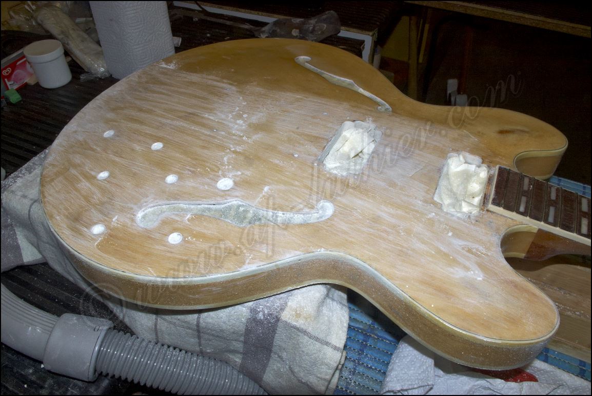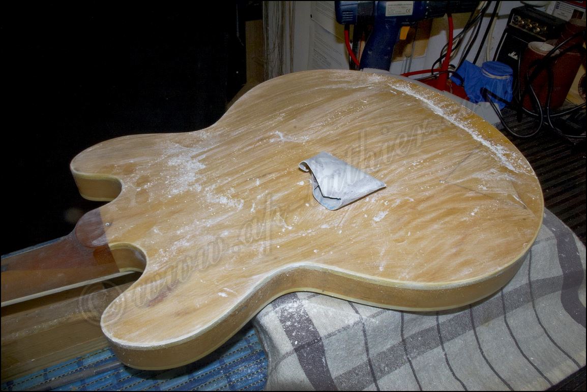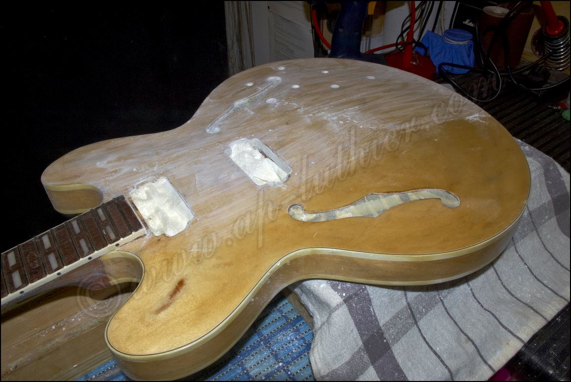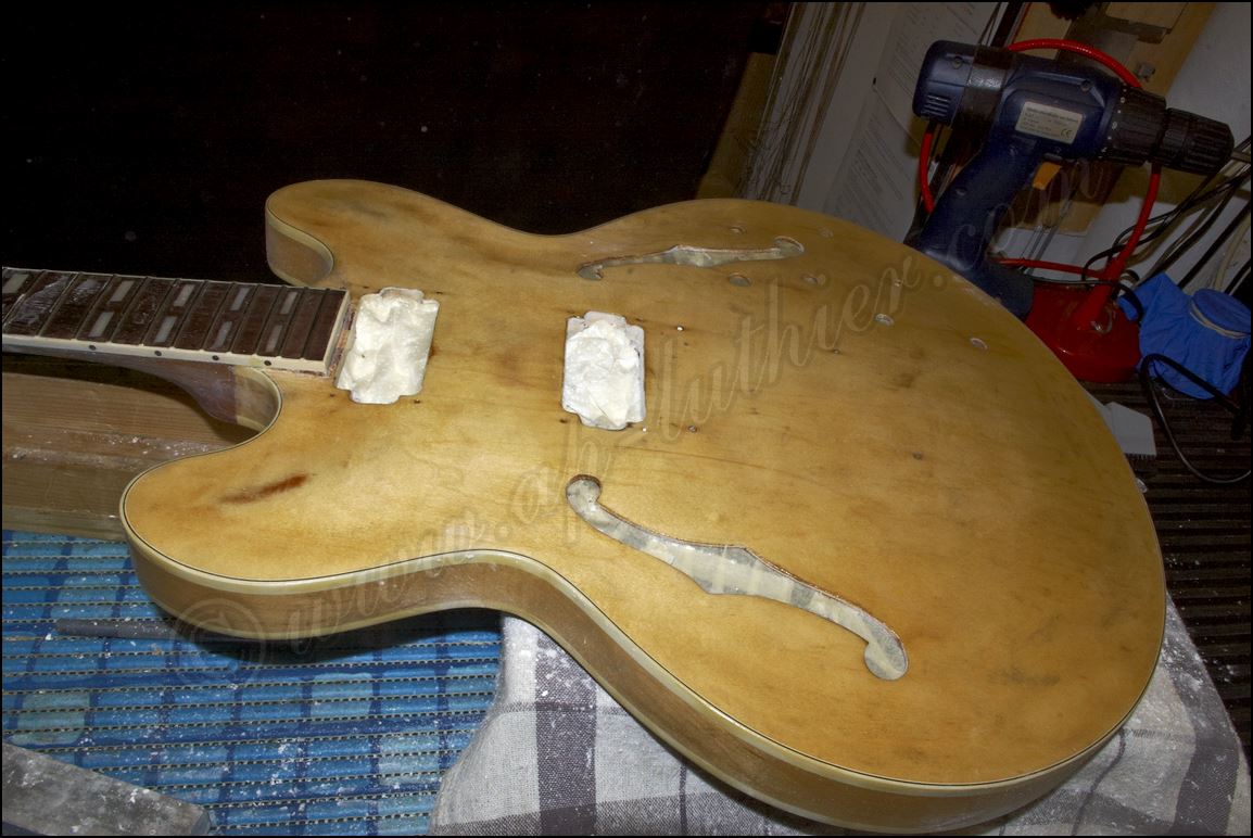 Desastre en una Gibson original ES-345 de 1961 Bueno poco queda, pero lo que queda es largo y tedioso. Capas y capas de acabado y horas de lijado para dejar la superficie apta para recibir las nuevas capas. Como pueden ver ya le coloqué el número de serie, pero no se los voy a mostrar por ser la identificación que solo le concierne al dueño. ![]() Quedó algo como esto, que aunque son números al azar, están hechos de la misma forma que en la guitarra, en un trozo de caoba de honduras y con la misma técnica. ![]() Mástil preparado y listo para recibir el color correspondiente ![]() Preparación del cuerpo en su parte trasera ![]() Igual en la parte delantera con sus efes y demas orificios tapados para que no ocurra lo anterior ![]() Proceso de lijado de la tapa delantera ![]() otra vista ![]() y por fin preparada para recibir el color definitivo ![]() Esta es la primera capa del color negro de las tres que llevará la guitarra a petición de su dueño, ya que le encanta ese color ![]() y viene de perlas para tapar los desastres realizados al instrumento ![]() Aquí está ya con las capas correspondientes al color negro y preparada con el binding descubierto para recibir la primera capa de acabado ![]() Vista por la parte de atrás ![]() Después de darle el tedioso acabado, tedioso por la larga espera que requiere la nitro y mas en una guitarra reconstruida, ya que como todos saben las huellas que quedan de la reparación, salen con el tiempo y se nota al pasar una luz por encima, pero mientras mas se espera mejor ya que da tiempo a que el acabado se seque mas y mas, y al pulir dure mucho mas sin presentar esta huella. Esto se produce por las distintas densidades que se encuentra el acabado en donde se impregna, y su absorción es distinta. Por eso aunque una guitarra sea de un color sólido a menos que le echen un acabado sintético y grueso, siempre se notan las uniones de la madera. Lo malo es que ese acabado crea una coraza que no permite que la madera vibre con libertad ahogando muchas frecuencias. Sin embargo aquí ya está lista con el acabado pulido. ![]() Detalle de el cuerpo recién pulido ![]() Y de la guitarra en general ![]() Ahora voy con la electrónica. La tenía guardada como oro en polvo ya que es una electrónica bastante aparatosa y se pueden fatigar fácilmente los materiales. Aquí pueden observar como una de las patillas está suelta, porque en realidad es una maraña de cables desorganizados y puestos como cuadrasen. ![]() Vaya chapuza. Y como esto en muchos lugares de la electrónica ![]() Que fácil es hacer las cosas ordenadamente. Se ahorra trabajo y espacio, además de quedar cómodo para la instalación ![]() "Houston, tenemos un problema" el cableado está mal hecho. Se conoce que el que hizo la electrónica además de romper la tapa trasera no tiene idea de esta electrónica. La pastilla del puente no suena, a pesar de que esta en perfectas condiciones, y faltan cables en algunos sitios y sobran en otros. El cliente sin saberlo ha estado tocando solo con la pastilla del mástil, pero no lo notaba porque le entramparon el sonido en el selector de tonos del Varitone. Menos mal que me conozco bien estas electrónicas ya que he reparado unas cuantas y es mas a las modernas se les hace una modificación para quitarle los transformadores que pesan bastante y se sustituyen con resistencias, lo cual hace el mismo efecto y aligera bastante el instrumento. Pero este hay que dejarlo original, así que no queda otra que arreglarlo. ![]() Este pote le dieron tanto calor y fundente que a parte de hacer un ruido del copón, ![]() no funcionaba correctamente. Vean las consecuencias de unas malas soldaduras. De paso estos potenciómetros al quedar expuestos a los elementos a través de la "F" cogen mucho polvo y humedad, por eso es muy recomendable dejarlos completamente secos, si no se tienen las cajitas protectoras, para que este no se adhiera a los mismos. ![]() Página Anterior Página Siguiente |