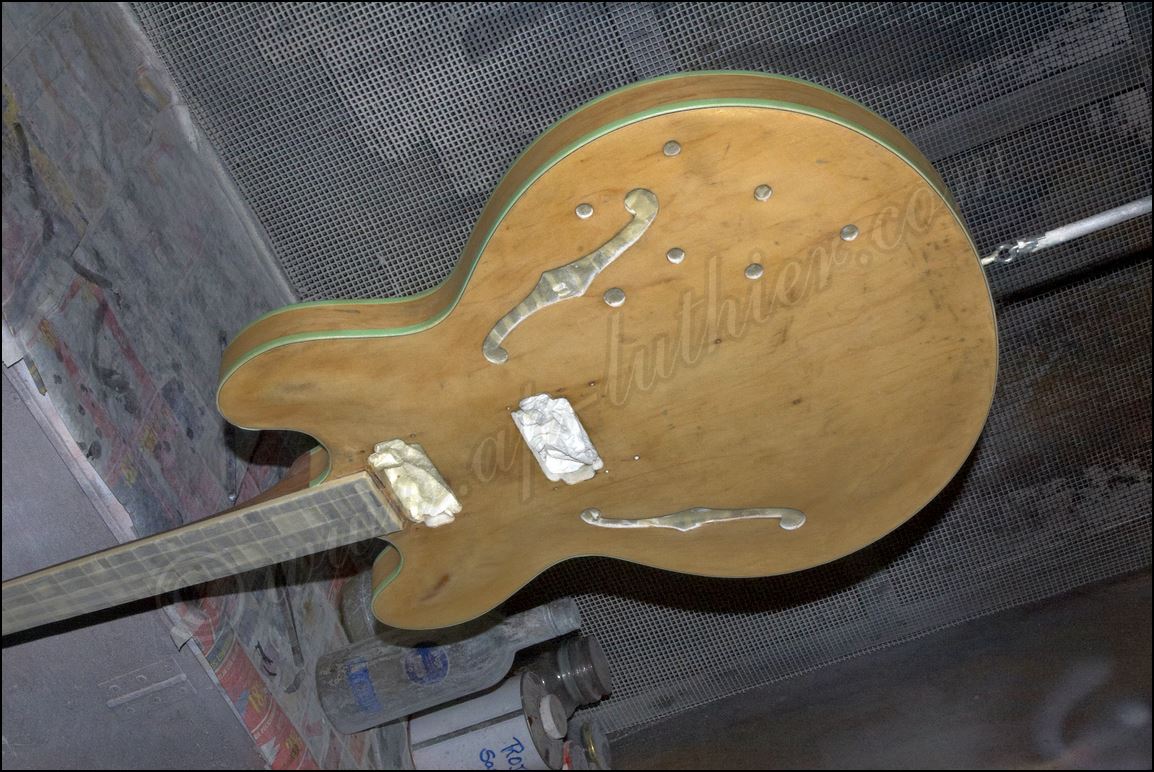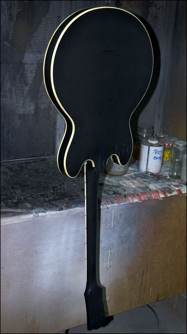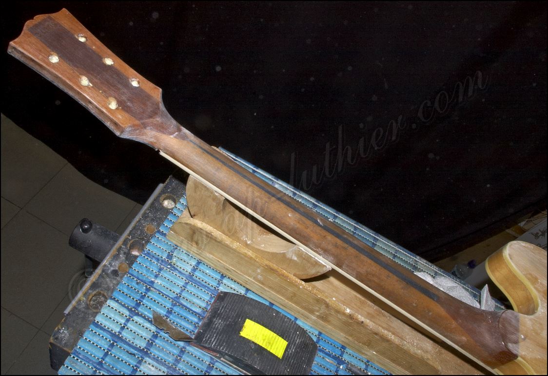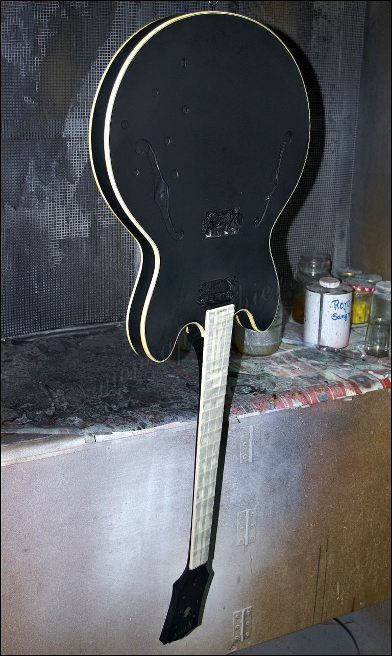 Desastre en una Gibson original ES-345 de 1961 Bueno poco queda, pero lo que queda es largo y tedioso. Capas y capas de acabado y horas de lijado para dejar la superficie apta para recibir las nuevas capas. Como pueden ver ya le coloqué el número de serie, pero no se los voy a mostrar por ser la identificación que solo le concierne al dueño. ![]() Quedó algo como esto, que aunque son números al azar, están hechos de la misma forma que en la guitarra, en un trozo de caoba de honduras y con la misma técnica. ![]() Mástil preparado y listo para recibir el color correspondiente ![]() Preparación del cuerpo en su parte trasera ![]() Igual en la parte delantera con sus efes y demas orificios tapados para que no ocurra lo anterior ![]() Proceso de lijado de la tapa delantera ![]() otra vista ![]() y por fin preparada para recibir el color definitivo ![]() Esta es la primera capa del color negro de las tres que llevará la guitarra a petición de su dueño, ya que le encanta ese color ![]() y viene de perlas para tapar los desastres realizados al instrumento ![]() Aquí está ya con las capas correspondientes al color negro y preparada con el binding descubierto para recibir la primera capa de acabado ![]() Vista por la parte de atrás ![]() Después de darle el tedioso acabado, tedioso por la larga espera que requiere la nitro y mas en una guitarra reconstruida, ya que como todos saben las huellas que quedan de la reparación, salen con el tiempo y se nota al pasar una luz por encima, pero mientras mas se espera mejor ya que da tiempo a que el acabado se seque mas y mas, y al pulir dure mucho mas sin presentar esta huella. Esto se produce por las distintas densidades que se encuentra el acabado en donde se impregna, y su absorción es distinta. Por eso aunque una guitarra sea de un color sólido a menos que le echen un acabado sintético y grueso, siempre se notan las uniones de la madera. Lo malo es que ese acabado crea una coraza que no permite que la madera vibre con libertad ahogando muchas frecuencias. Sin embargo aquí ya está lista con el acabado pulido. ![]() Detalle de el cuerpo recién pulido ![]() Y de la guitarra en general ![]() Ahora voy con la electrónica. La tenía guardada como oro en polvo ya que es una electrónica bastante aparatosa y se pueden fatigar fácilmente los materiales. Aquí pueden observar como una de las patillas está suelta, porque en realidad es una maraña de cables desorganizados y puestos como cuadrasen. ![]() Vaya chapuza. Y como esto en muchos lugares de la electrónica ![]() Que fácil es hacer las cosas ordenadamente. Se ahorra trabajo y espacio, además de quedar cómodo para la instalación ![]() "Houston, tenemos un problema" el cableado está mal hecho. Se conoce que el que hizo la electrónica además de romper la tapa trasera no tiene idea de esta electrónica. La pastilla del puente no suena, a pesar de que esta en perfectas condiciones, y faltan cables en algunos sitios y sobran en otros. El cliente sin saberlo ha estado tocando solo con la pastilla del mástil, pero no lo notaba porque le entramparon el sonido en el selector de tonos del Varitone. Menos mal que me conozco bien estas electrónicas ya que he reparado unas cuantas y es mas a las modernas se les hace una modificación para quitarle los transformadores que pesan bastante y se sustituyen con resistencias, lo cual hace el mismo efecto y aligera bastante el instrumento. Pero este hay que dejarlo original, así que no queda otra que arreglarlo. ![]() Este pote le dieron tanto calor y fundente que a parte de hacer un ruido del copón, ![]() no funcionaba correctamente. Vean las consecuencias de unas malas soldaduras. De paso estos potenciómetros al quedar expuestos a los elementos a través de la "F" cogen mucho polvo y humedad, por eso es muy recomendable dejarlos completamente secos, si no se tienen las cajitas protectoras, para que este no se adhiera a los mismos. ![]() Página Anterior Página Siguiente |