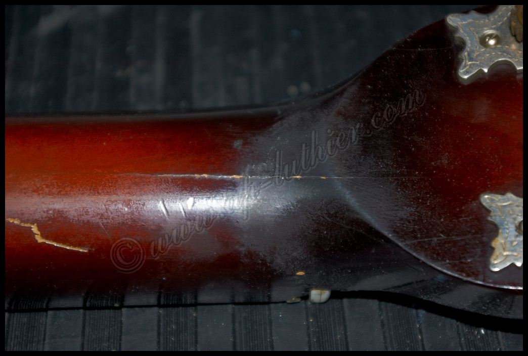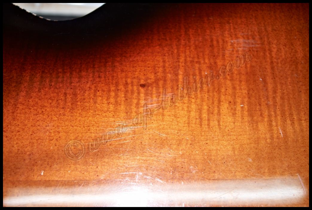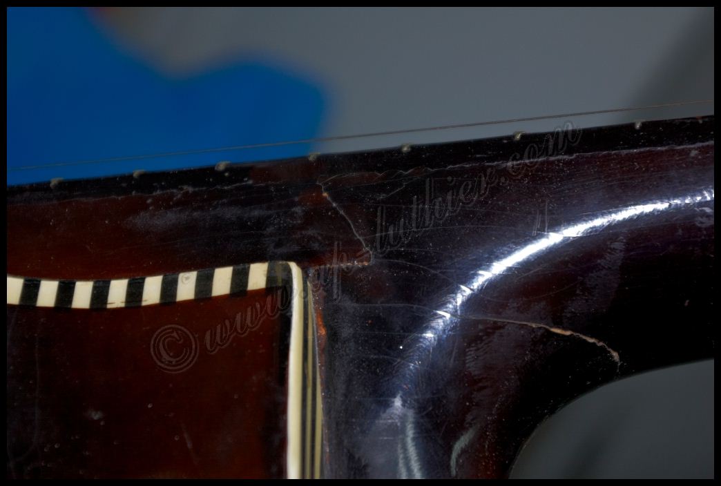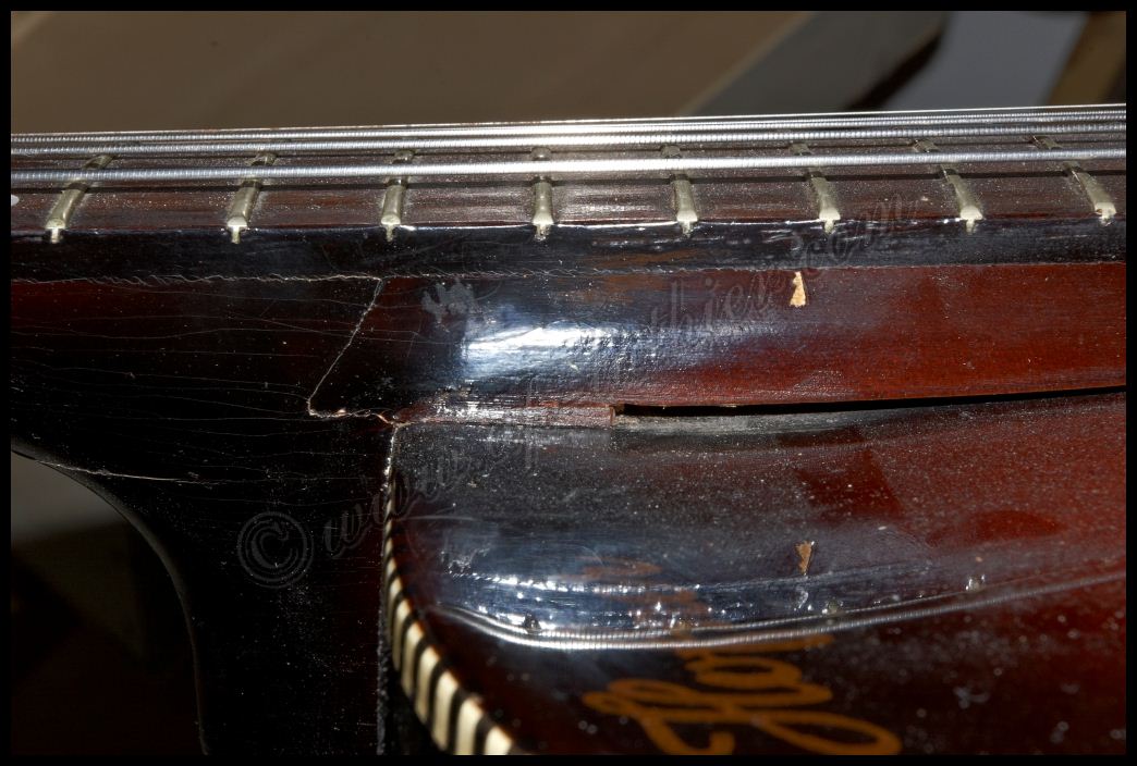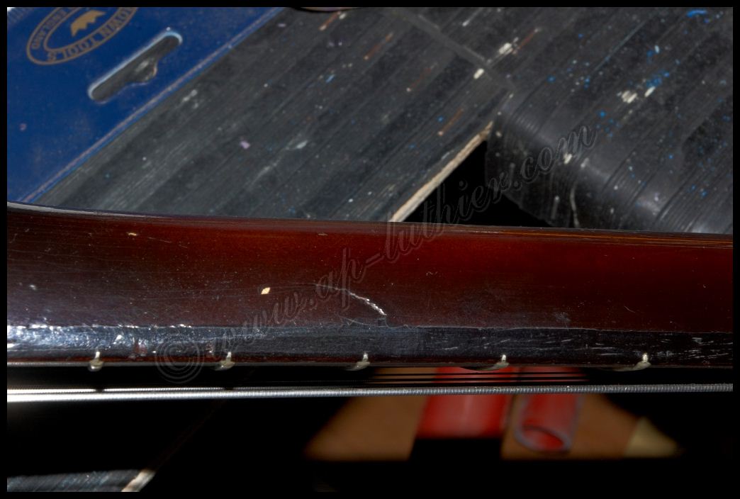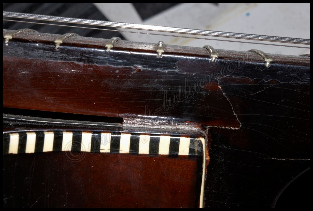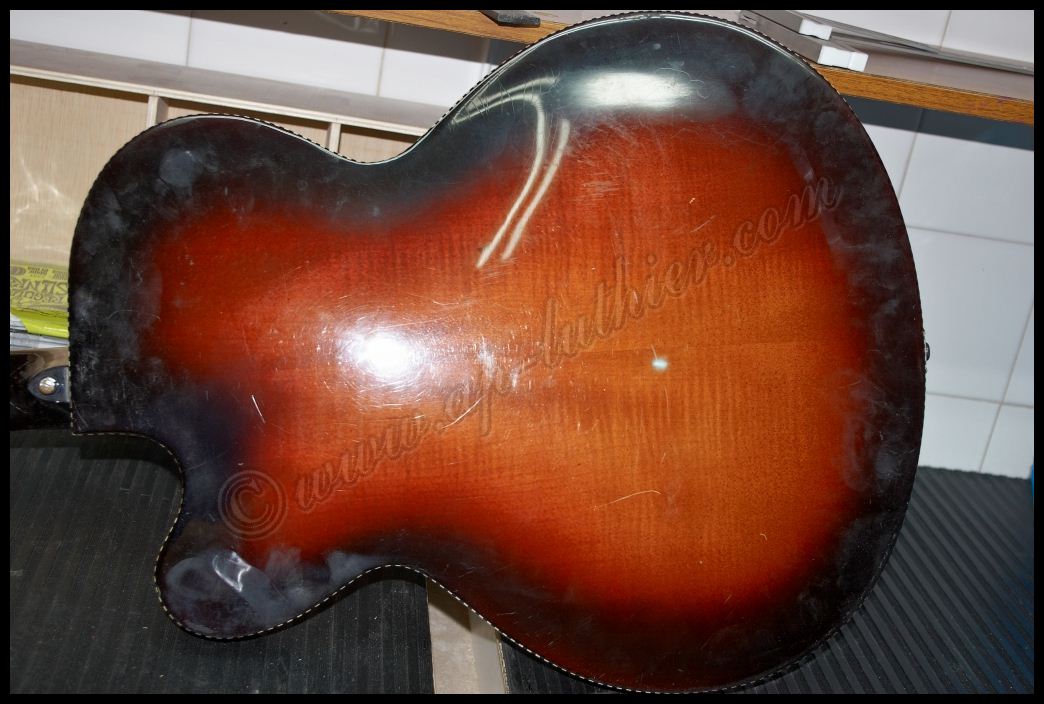Reconstrucción de otra guitarra antigua marca Hofner Hola a todos, vengo de nuevo con otra reconstrucción bastante profunda en una guitarra. Esta vez se trata de otra Hofner, pero esta vez es electroacústica. La guitarra llegó bastante deteriorada tanto por el uso, como por la edad y por accidentes de uso. A su vez voy a aprovechar para ilustrar un poco mi trabajo, ya que muchas veces no nos damos de cuenta por desconocimiento, que aunque externamente se pueden ver algunas cosas, solo cuando se examina en profundidad un instrumento es que se descubren los verdaderos problemas, y a la hora de hacer un presupuesto, es imposible que uno pueda plasmar de forma preliminar, la realidad de lo que ocurre. Al comenzar a realizar el análisis preliminar fue evidente que había una rotura importante en el mástil ![]() Así como un desprendimiento de las piezas encoladas, debido al uso de colas que no perduran en el tiempo. ![]() Que trae como consecuencia que los distintos componentes encolados, cedan ante la tensión de las cuerdas ![]() Además las Hofner fueron diseñadas con muchas piezas encoladas, lo que hace que prácticamente se despiecen ![]() Por otra parte, las piezas de plástico de la época, estaban echas con compuestos que muy lentamente se evaporan, y con el transcurso de los años se van contrayendo poco a poco, con lo que se va descubriendo la madera que hay debajo. Pero esto tiene su encanto Vintage, y aunque parezca extraño le da valor al instrumento. ![]() El aspecto trasero del cuerpo, es un aspecto bastante normal por el uso, pero si se fijan bien, hay defectos que no son producto del tiempo, si no de una aplicación defectuosa del acabado. A simple vista se puede ver que el Binding casi no se nota, y que el acabado es bastante oscuro para ser una tapa de arce rizado. Esto tiene su razón pero se verá e porque un poco mas adelante ![]() Una foto con mas detalle, revela que la aplicación del acabado, no fue realizado de una forma profesional como nos tiene habituado esta marca. Esas marcas en forma de pecas, son producto de una aplicación con un instrumento mal graduado o con problemas. ![]() Continuando con el examen preliminar, poco a poco se va descubriendo que el mástil está en peor estado de lo que se esperaba. Lo que a simple vista parecían desconchones y grietas de la laca, al examinarlo mas de cerca, se aprecia que son roturas en la madera. ![]() En esta se puede apreciar que hay otro problema mas grave, y es que el mástil está parcialmente roto en la unión con el cuerpo ![]() Los clavijeros y la pala, presentan heridas normales en cualquier guitarra de esa edad ![]() Otro aspecto que llama la atención, es que los ejes del selector estén colocados directamente en la madera, sin una protección adecuada, y como es lógico, al accionar hacia un lado u otro, dichos ejes hacen que salte el esmalte alrededor de los mismos. ![]() Otro problema que se siente al accionar los interruptores, es que hay algo suelto en la placa, y no se pueden accionar con libertad. ![]() A nivel de pastillas todo parece normal, pero las pastillas no responden, cosa que aun no se puede decir nada ya que hay que desmontarlas, y examinarlas independientemente desconectadas de la electrónica. ![]() En esta foto se puede apreciar lo mismo que en la parte de atras. Hay exceso de laca, y esta inexplicablemente tapa el binding ![]() Los cromados están opacos por el paso del tiempo ![]() En esta toma se puede apreciar que el mástil casi toca el cuerpo, corroborando la sospecha de rotura parcial del mástil, además de algunas heridas del golpeador ![]() Aquí se puede ver, que el puente está en muy mal estado, y algo sorprendente, y es que hasta el binding de las efes está pintado por encima con el acabado del cuerpo. Esto le quita belleza y se entrevé que hay algo mas que ocurre, pero que está oculto. ![]() Otro detalle del puente, que obedece únicamente a la apariencia mas no a la funcionalidad de la pieza. ![]() En esta toma se aprecia desde el otro lado como la tapa armónica está aguantando toda la tensión de las cuerdas. Esto es muy peligroso, ya que ha podido tener consecuencias nefastas para el instrumento. Por suerte se pilló a tiempo. ![]() La electrónica bastante deteriorada por el uso, necesita una reconstrucción urgente. Por otra parte tambien se puede apreciar como aplicaron la laca encima del binding de la efe derecha ![]() Pagina siguiente |