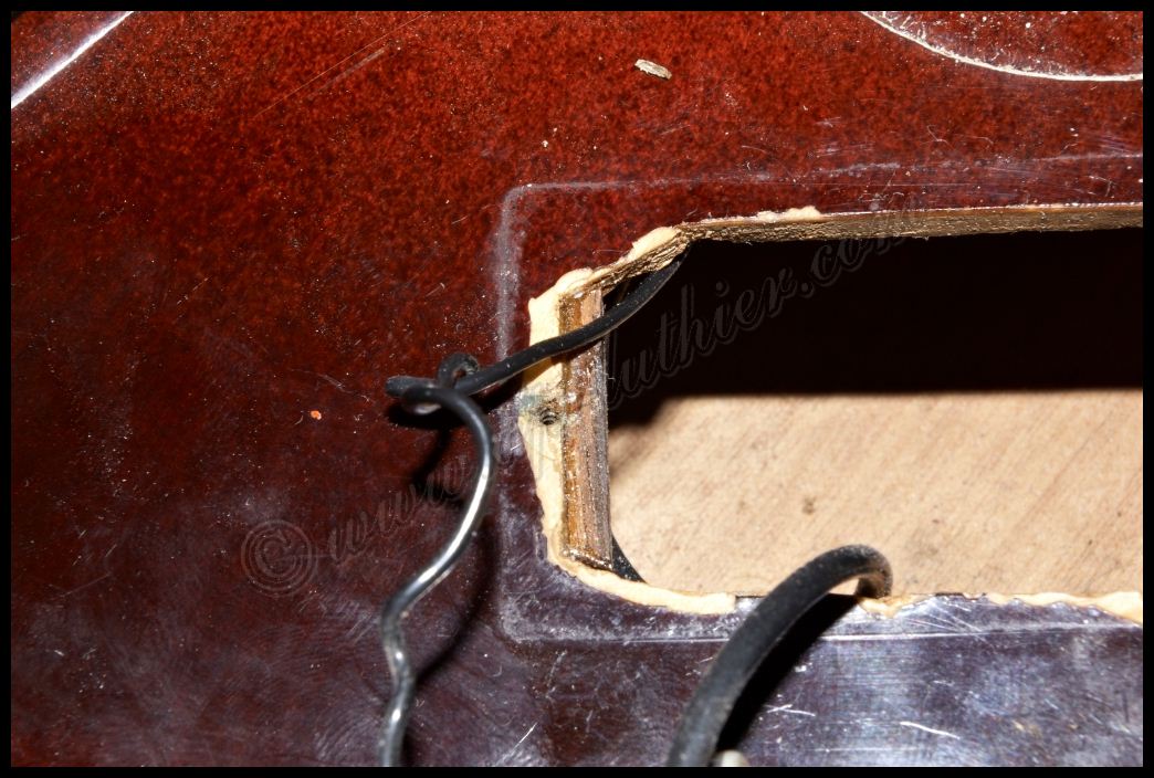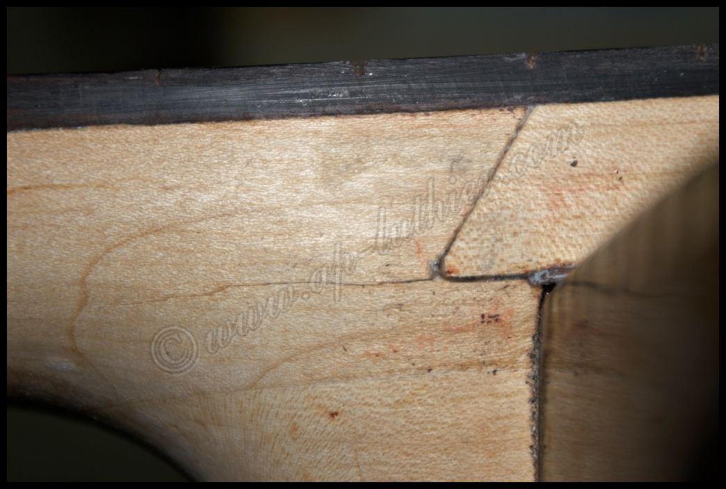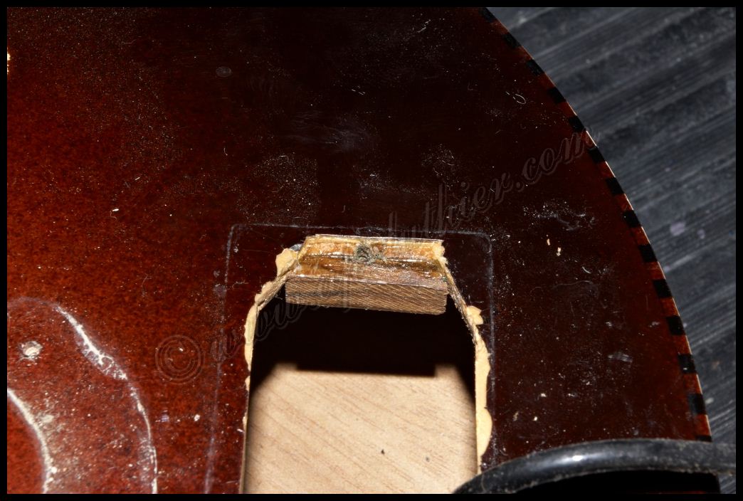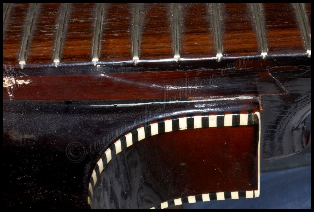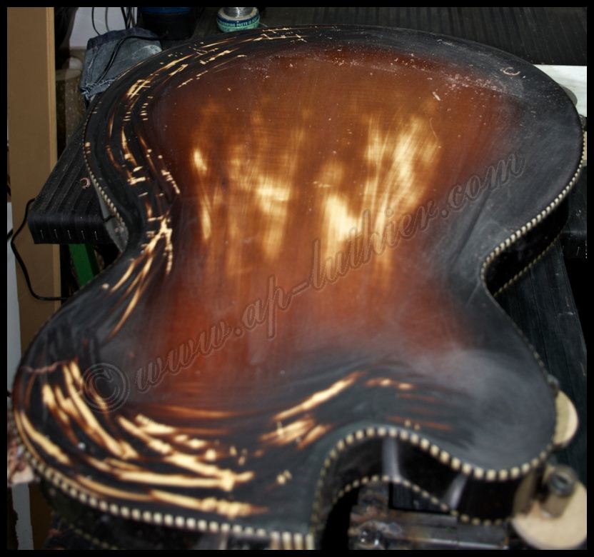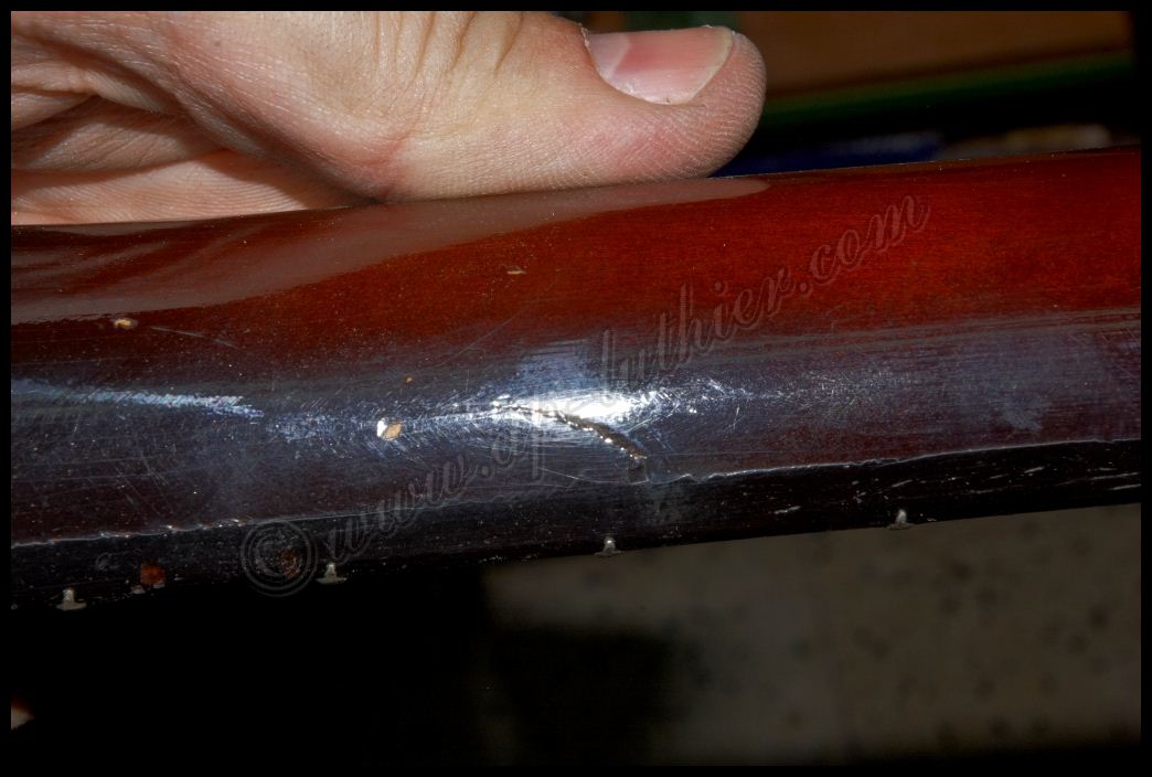 Reconstrucción de otra guitarra antigua marca Hofner Oxido, polvo, pelusas, suciedad, etc., impiden un buen contacto y funcionamiento de los dispositivos. ![]() ![]() Al examinar el orificio donde se aloja parte de la electrónica, veo con asombro algo que me van a perdonar pero solo puedo calificar como soberana chapuza. El que recortó el cuerpo de la guitarra, se conoce que tomó mal las medidas, y se pasó un poco con el corte, y luego ante la imposibilidad de colocar los tornillos en su sitio, mal encoló una pieza de cualquier madera que tenia a mano para suplementar el error ![]() Lo peor es que también lo hizo en el otro lado. Es bastante extraño que un fabricante Alemán con esa tradición de artesanos de alta calidad, cometieran estas faltas de principiante. ![]() Al descubrir el selecto, se puede ver mas delo mismo. Pero desvíen la vista hacia la derecha, para que vean con detalle el binding debajo de la pintura. Inexplicable ![]() ![]() Por todos lados hay roturas de la madera importantes, por lo que ya se puede ver que se necesita una reconstrucción a fondo ![]() ![]() ![]() Una vez concretado el presupuesto y la reparación a efectuar, no queda mas que trabajar en ello. Lo primero fue sencillo destrastear el diapasón. ![]() Luego ir poco a poco desvelando con profundidad los problemas para ir trabajando y tomando decisiones sobre la marcha. Comienzan a aparecer problemas ocultos por el pigmento. Roturas muy profundas de la fibra, así como ¿Nudos? ![]() Esta toma muestra la continuidad de la grieta, que justamente está en la zona del alma ![]() y recorre el mástil en todo el trayecto en el cual esta se aloja. A su vez aparecen mas huellas de un arce no de mala calidad, si no de un aspecto que la mayoría desechamos a menos que se utilice para instrumentos de un color oscuro como es este caso. ![]() Siguen apareciendo nudos por todos lados y algunos hasta con colores extraños ![]() En esta toma se puede ver que la grieta comienza a ser mas pronunciada, y dentro de ella hay restos del uso del instrumento, con lo que denota que la misma atraviesa toda la pared hasta el alma. ![]() En este punto ya es evidente lo peor. Hay que extraer el diapasón para arreglar esta rotura tanto interna como externamente. ![]() A su vez también se descubre la magnitud de la rotura y desencolado del mástil a nivel del cuerpo ![]() Ya que hay que repigmentar algunas partes importantes, pues se decidió por parte del dueño hacer una reconstrucción completa del instrumento, para dejarlo 100% funcional y en condiciones. Este es el aspecto después de un lijado exhaustivo, en donde es tal la cantidad de poliuretano aplicado que es inconcebible. ![]() Hubo que utilizar métodos mucho mas agresivos para poder quitar todo ese blindaje que le aplicaron. Es tan fuerte este acabado, que los disolventes no lo atacan, por lo que hubo que emplear perfiles de acero afilados y con curvas específicas para quitar esta coraza con delicadeza y sin que se estropee la madera ![]() Página anterior Página siguiente |