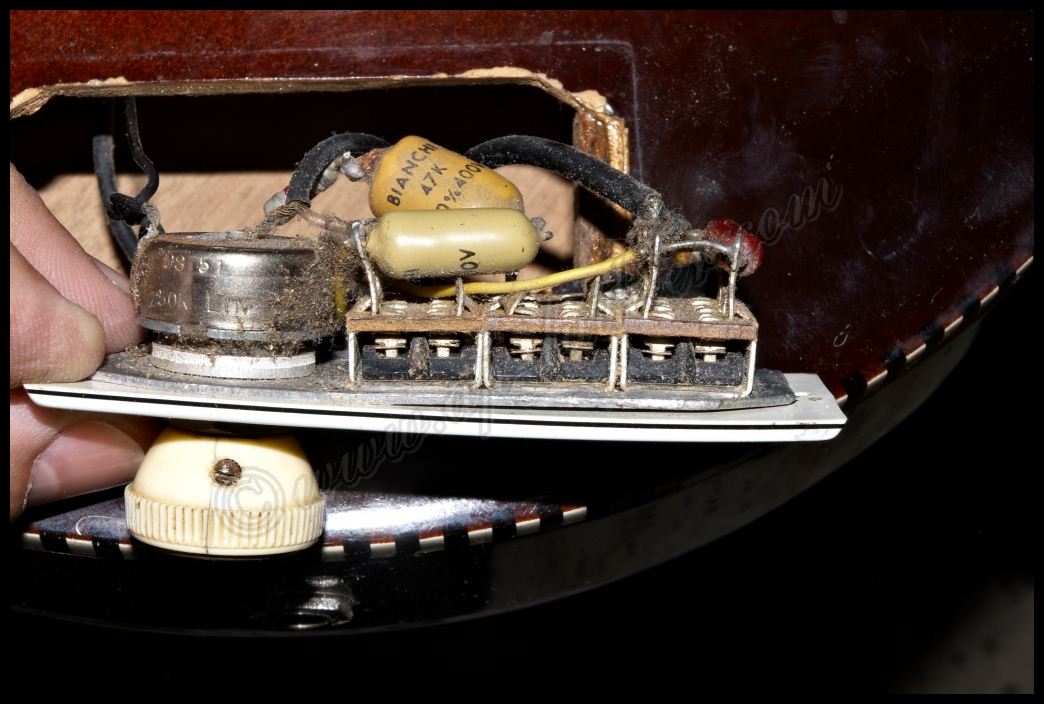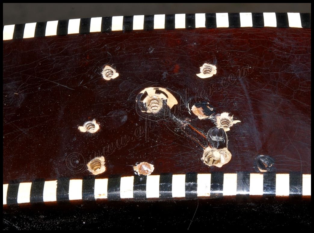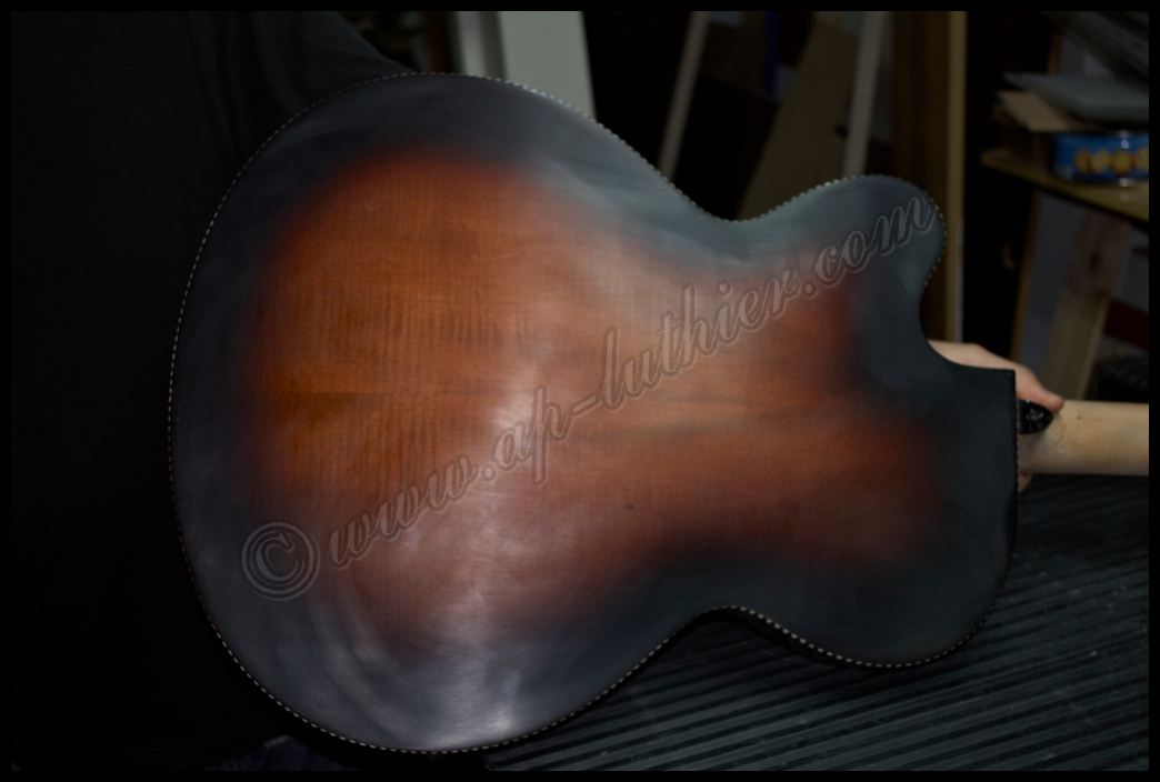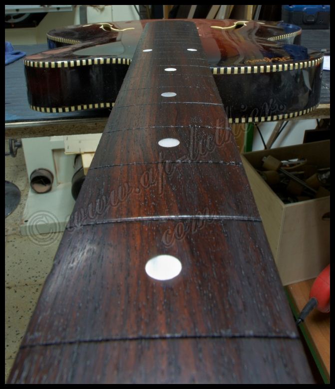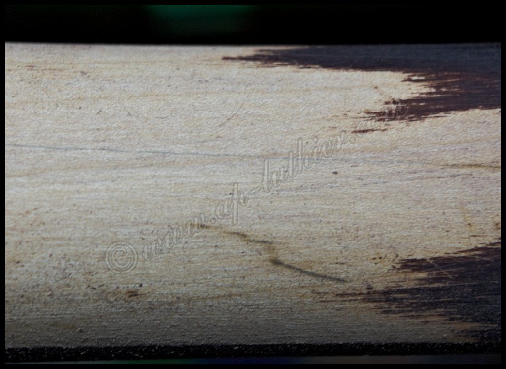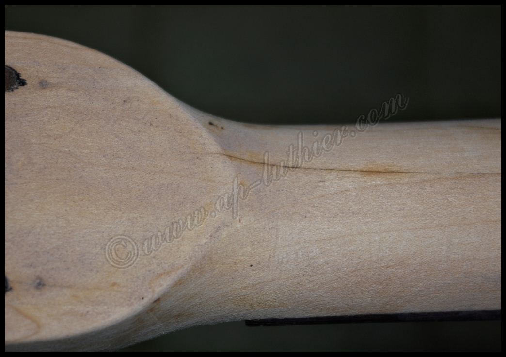 Reconstrucción de otra guitarra antigua marca Hofner Oxido, polvo, pelusas, suciedad, etc., impiden un buen contacto y funcionamiento de los dispositivos. ![]() ![]() Al examinar el orificio donde se aloja parte de la electrónica, veo con asombro algo que me van a perdonar pero solo puedo calificar como soberana chapuza. El que recortó el cuerpo de la guitarra, se conoce que tomó mal las medidas, y se pasó un poco con el corte, y luego ante la imposibilidad de colocar los tornillos en su sitio, mal encoló una pieza de cualquier madera que tenia a mano para suplementar el error ![]() Lo peor es que también lo hizo en el otro lado. Es bastante extraño que un fabricante Alemán con esa tradición de artesanos de alta calidad, cometieran estas faltas de principiante. ![]() Al descubrir el selecto, se puede ver mas delo mismo. Pero desvíen la vista hacia la derecha, para que vean con detalle el binding debajo de la pintura. Inexplicable ![]() ![]() Por todos lados hay roturas de la madera importantes, por lo que ya se puede ver que se necesita una reconstrucción a fondo ![]() ![]() ![]() Una vez concretado el presupuesto y la reparación a efectuar, no queda mas que trabajar en ello. Lo primero fue sencillo destrastear el diapasón. ![]() Luego ir poco a poco desvelando con profundidad los problemas para ir trabajando y tomando decisiones sobre la marcha. Comienzan a aparecer problemas ocultos por el pigmento. Roturas muy profundas de la fibra, así como ¿Nudos? ![]() Esta toma muestra la continuidad de la grieta, que justamente está en la zona del alma ![]() y recorre el mástil en todo el trayecto en el cual esta se aloja. A su vez aparecen mas huellas de un arce no de mala calidad, si no de un aspecto que la mayoría desechamos a menos que se utilice para instrumentos de un color oscuro como es este caso. ![]() Siguen apareciendo nudos por todos lados y algunos hasta con colores extraños ![]() En esta toma se puede ver que la grieta comienza a ser mas pronunciada, y dentro de ella hay restos del uso del instrumento, con lo que denota que la misma atraviesa toda la pared hasta el alma. ![]() En este punto ya es evidente lo peor. Hay que extraer el diapasón para arreglar esta rotura tanto interna como externamente. ![]() A su vez también se descubre la magnitud de la rotura y desencolado del mástil a nivel del cuerpo ![]() Ya que hay que repigmentar algunas partes importantes, pues se decidió por parte del dueño hacer una reconstrucción completa del instrumento, para dejarlo 100% funcional y en condiciones. Este es el aspecto después de un lijado exhaustivo, en donde es tal la cantidad de poliuretano aplicado que es inconcebible. ![]() Hubo que utilizar métodos mucho mas agresivos para poder quitar todo ese blindaje que le aplicaron. Es tan fuerte este acabado, que los disolventes no lo atacan, por lo que hubo que emplear perfiles de acero afilados y con curvas específicas para quitar esta coraza con delicadeza y sin que se estropee la madera ![]() Página anterior Página siguiente |