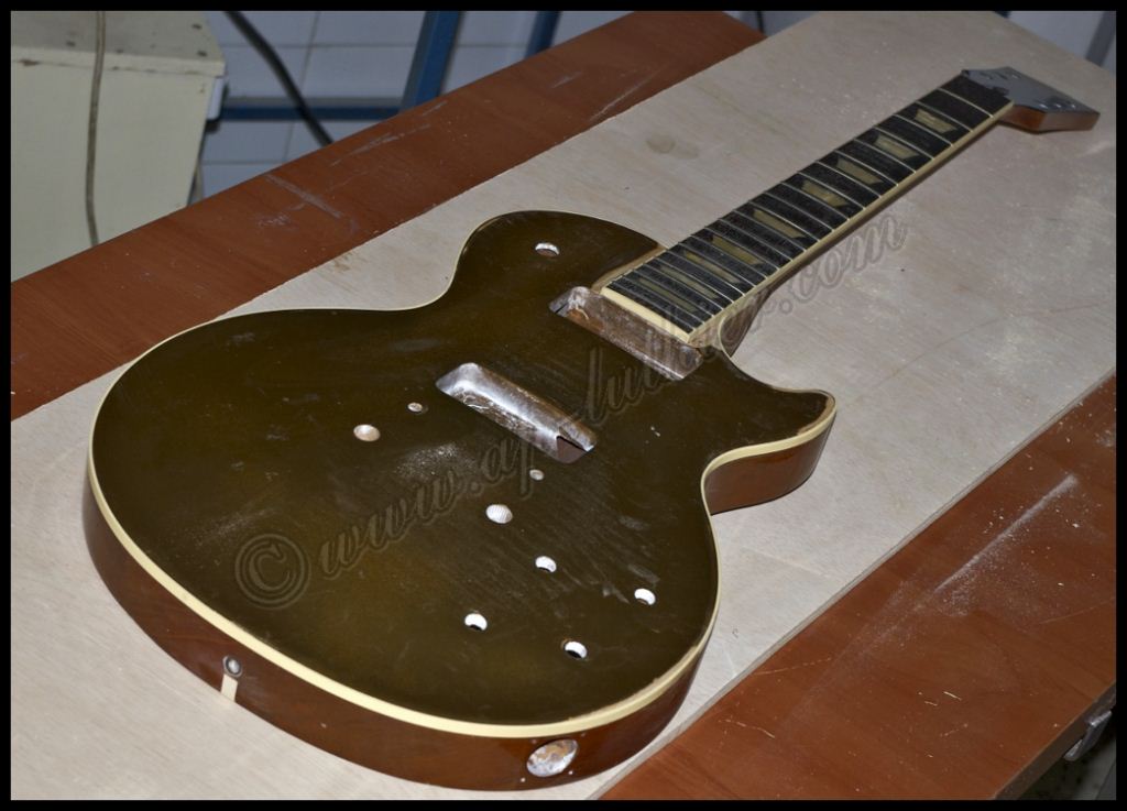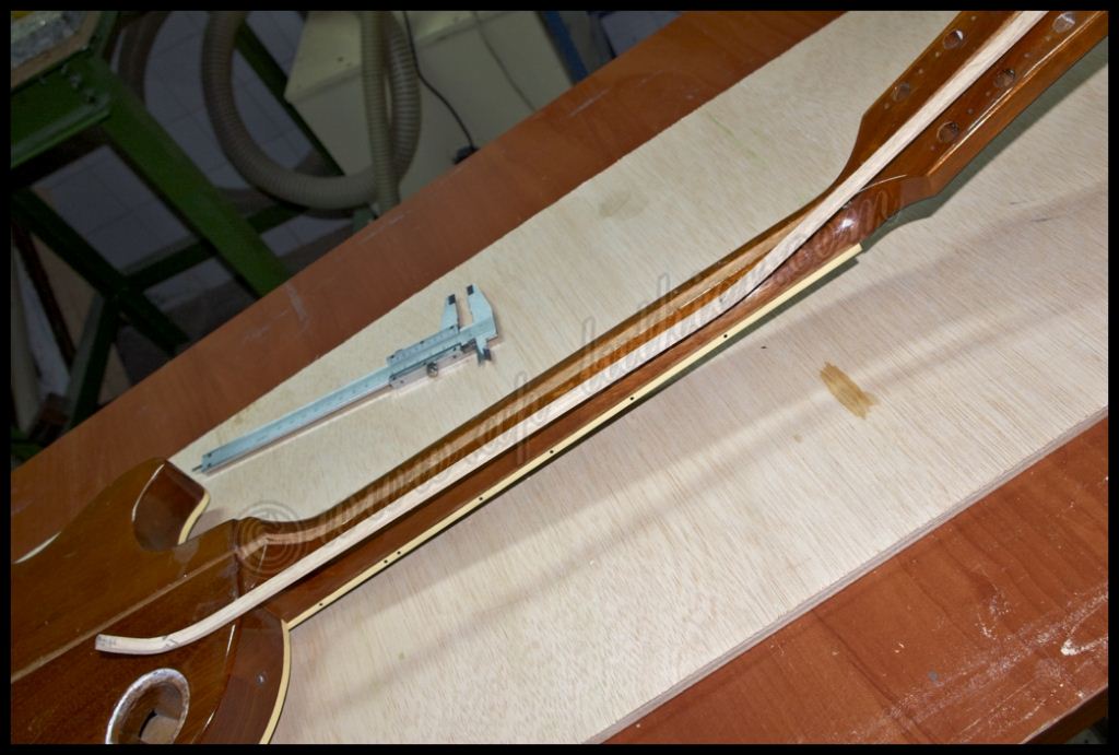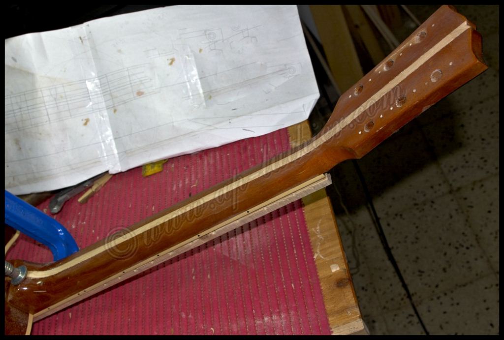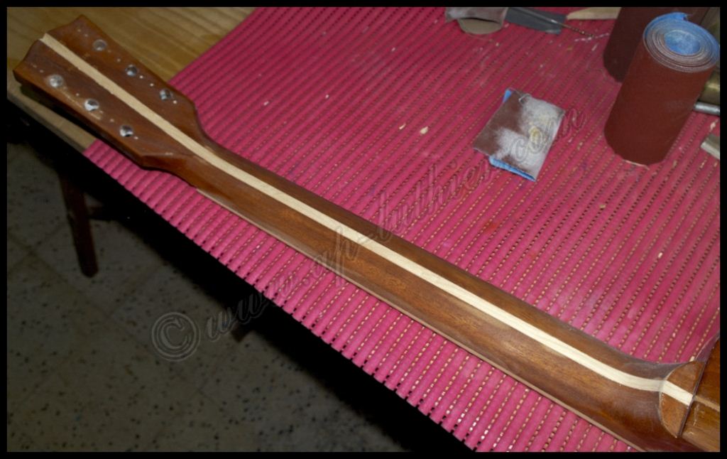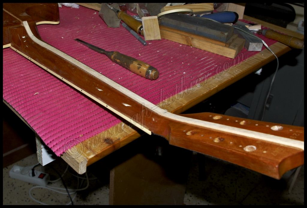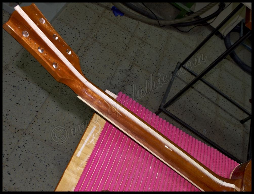 Old Black Neil Young Réplica Hay muchas historias al respecto, pero nadie sabe con certeza el porque. Solo se pueden sacar conjeturas basándose en hechos ocurridos en la época. Se supone que esta guitarra ha sufrido un accidente. Esta suposición se fundamenta en dos detalles. Una es la franja de arce que atraviesa el mástil, y la otra es la "Espiga de trigo" que hay colocada en la pala. Como todos saben, el modelo Les Paul sufrió un cambio drástico en el 61 por la caída de las ventas en este modelo, y decidieron renovar completamente el diseño de la misma. Hecho al que se opuso el propio Les Paul, el cual afirmaba que esa no era su guitarra. A pesar de que salieron algunos modelos con su firma estampada, Gibson tuvo que cambiar esta por la famosa espiga de trigo. En la foto de abajo una pala original de la época. También experimentaron con volutas y mástiles combinados de caoba con arce para intentar solucionar un problema de rotura en la pala ![]() de ahí la teoría de que la guitarra tuvo que sufrir un accidente por esas fechas y que tuvieron que cambiarle el mástil. Este hecho se reafirma porque todas las guitarras reparadas por esa época por Gibson, presentan la misma pala. Por eso lleva la espiga en vez de la tradicional firma, además como se verá mas adelante tiene otro detalle importante. Volviendo al mástil, algunos luthieres y fabricantes optaron por pintar la franja de atrás, ya que es mucho mas fácil y no todos poseen los medios para hacerla en condiciones a partir de un modelo ya terminado, pero en esta ocasión, tanto el dueño como un servidor, queremos que sea una copia lo mas fiel posible a la original, por lo tanto hay que trabajar un poquito mas. La solución es incrustarle una tira de arce, y para ello primero hay que realizar un canal. Para ello tuve que diseñar y construir herramientas especiales para este trabajo. ![]() Una vez hecho se puede apreciar un surco no muy profundo, para no llegar al alma, pero si lo suficiente para que esta tira ejerza su función estética y a la vez de refuerzo. ![]() Como se puede ver, el fresado es un poco complicado ya que no es lo mismo trabajar en maderas vírgenes y darles forma, que trabajar sobre un instrumento ya hecho en donde hay que adaptarse a las superficies irregulares ya hechas. ![]() Al final el surco desde la base del cuerpo hasta ![]() la pala ![]() Preparando el perfil de arce duro para ![]() darle forma térmicamente, ![]() Ver que todo cuadra sin problemas ![]() reajustar sus cotas ![]() y encolarlo, comenzando por la parte de la base ![]() y luego a lo largo del mástil ![]() Una vez emparejado la tira con la superficie curva del mástil, da un aspecto de un mástil compuesto. ![]() Detalle en la base del mismo. ![]() ![]() ![]() Curiosamente el surco no tiene arce en toda su extensión. Hay una parte en la que a parte de ser irregular, en la original si se fijan con detalle en las primeras fotos, está hueco. Otro misterio que aclarar. ![]() Luego realicé el famoso orificio, que nadie sabe para que fue realizado. Nadie sabe lo que hay debajo de esa tapa. Hay muchas especulaciones que si el cuerpo también sufrió con el accidente y tuvo que ser reforzado en esa zona, que si es un acceso para ajustar el puente, (Cosa poco probable ya que está mas arriba, en todo caso coincide con el Bigsby), sin embargo personalmente creo que la explicación es mucho mas sencilla y como cosa rara no lo he leído por ahí. Es tan sencillo como que quizás originalmente se le comenzó a instalar o inclusive que se le fuese instalado el micro interruptor que hay entre los potenciómetros, en ese lugar, y que al darse cuenta del Bigsby o cuando se lo pusieron, ya que no se sabe que fue primero, tuviesen que reubicarlo en la posición que se encuentra en la actualidad. el caso es que solo nos interesa la apariencia, y es suficiente con realizar un alojamiento para colocarle una tapa como la del selector. ![]() Un par de vistas de como está quedando el mueble tanto en la parte de atrás ![]() como en la parte delantera ![]() Otra modificación significativa es en la pala. No se sabe si originalmente se le arrancó el binding a una pala con ella, o si bien le hicieron el surco para colocarla posteriormente. El caso es que en la original este surco está ahí. Pues bien habrá que hacérselo a la copia ![]() ![]() Sin embargo he aquí una de las cosas que sorprenden de un fabricante de renombre. Uno espera encontrarse madera, pero en este caso me encontré con una lámina de metacrilato. Con razón, lijé previamente el logotipo de la firma, y no se iba, pensaba que era una serigrafía bastante profunda que luego sacaría lijando un poco mas como en otros modelos, pero ahora me doy de cuenta que es metacrilato de color dorado incrustado en el negro. Como idea magnífica, pero para un instrumento no tanto. Las roturas en este material son estallidos, y un golpe o grieta es mucho mas difícil de reparar. ![]() Una lámina de 1/16 de pulgada recubre esta zona, que tendré que quitar también ya que para darle el efecto envejecido a la pala es imposible. El plástico no se gasta, ni rompe, ni queda como la madera, haciendo imposible darle el mismo efecto, a menos que se maquille con pigmentos, pero este no es el caso. ![]() Página Anterior Página Siguiente |