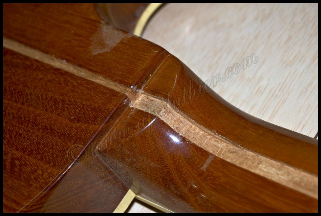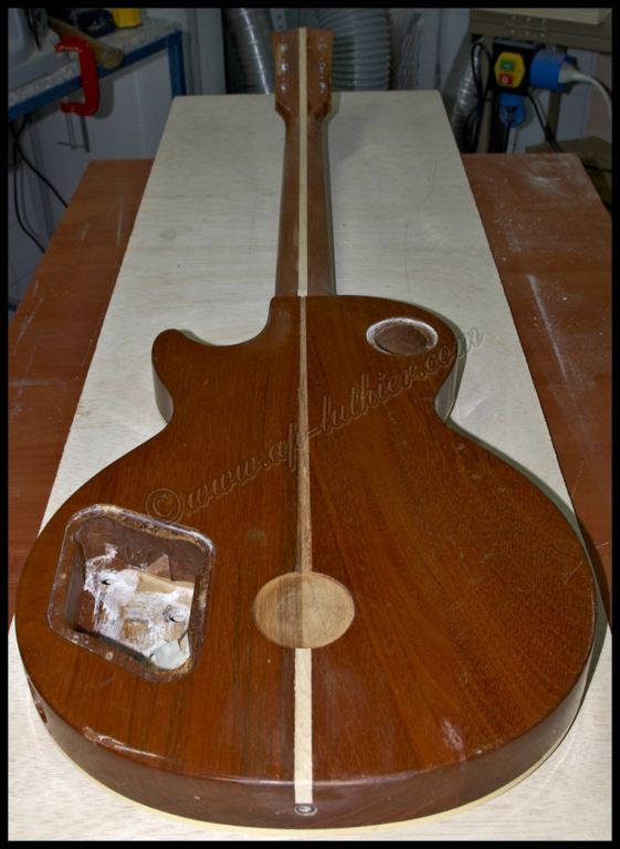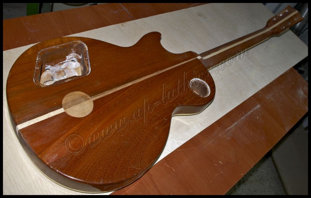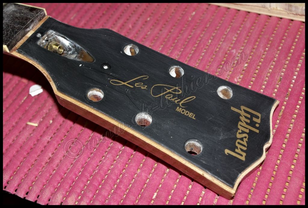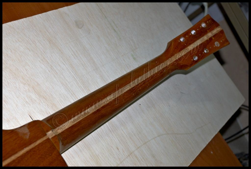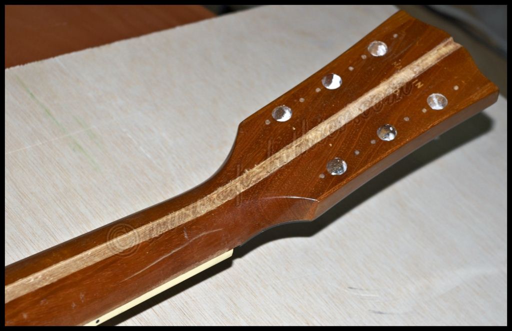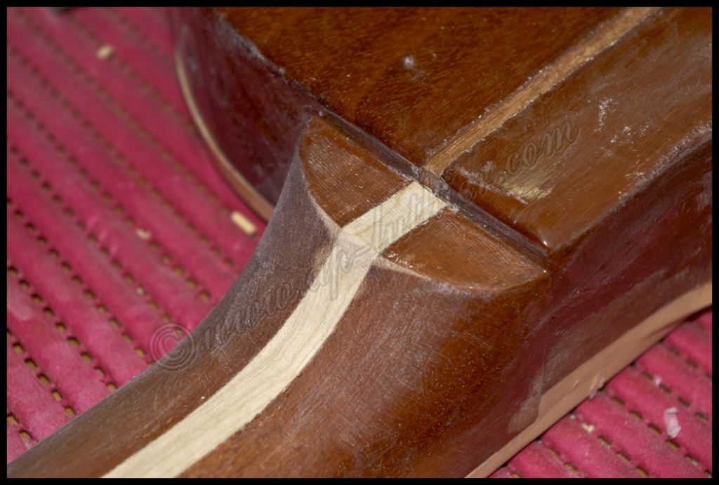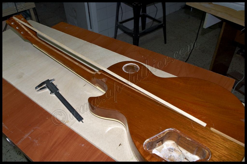 Old Black Neil Young Réplica Hay muchas historias al respecto, pero nadie sabe con certeza el porque. Solo se pueden sacar conjeturas basándose en hechos ocurridos en la época. Se supone que esta guitarra ha sufrido un accidente. Esta suposición se fundamenta en dos detalles. Una es la franja de arce que atraviesa el mástil, y la otra es la "Espiga de trigo" que hay colocada en la pala. Como todos saben, el modelo Les Paul sufrió un cambio drástico en el 61 por la caída de las ventas en este modelo, y decidieron renovar completamente el diseño de la misma. Hecho al que se opuso el propio Les Paul, el cual afirmaba que esa no era su guitarra. A pesar de que salieron algunos modelos con su firma estampada, Gibson tuvo que cambiar esta por la famosa espiga de trigo. En la foto de abajo una pala original de la época. También experimentaron con volutas y mástiles combinados de caoba con arce para intentar solucionar un problema de rotura en la pala ![]() de ahí la teoría de que la guitarra tuvo que sufrir un accidente por esas fechas y que tuvieron que cambiarle el mástil. Este hecho se reafirma porque todas las guitarras reparadas por esa época por Gibson, presentan la misma pala. Por eso lleva la espiga en vez de la tradicional firma, además como se verá mas adelante tiene otro detalle importante. Volviendo al mástil, algunos luthieres y fabricantes optaron por pintar la franja de atrás, ya que es mucho mas fácil y no todos poseen los medios para hacerla en condiciones a partir de un modelo ya terminado, pero en esta ocasión, tanto el dueño como un servidor, queremos que sea una copia lo mas fiel posible a la original, por lo tanto hay que trabajar un poquito mas. La solución es incrustarle una tira de arce, y para ello primero hay que realizar un canal. Para ello tuve que diseñar y construir herramientas especiales para este trabajo. ![]() Una vez hecho se puede apreciar un surco no muy profundo, para no llegar al alma, pero si lo suficiente para que esta tira ejerza su función estética y a la vez de refuerzo. ![]() Como se puede ver, el fresado es un poco complicado ya que no es lo mismo trabajar en maderas vírgenes y darles forma, que trabajar sobre un instrumento ya hecho en donde hay que adaptarse a las superficies irregulares ya hechas. ![]() Al final el surco desde la base del cuerpo hasta ![]() la pala ![]() Preparando el perfil de arce duro para ![]() darle forma térmicamente, ![]() Ver que todo cuadra sin problemas ![]() reajustar sus cotas ![]() y encolarlo, comenzando por la parte de la base ![]() y luego a lo largo del mástil ![]() Una vez emparejado la tira con la superficie curva del mástil, da un aspecto de un mástil compuesto. ![]() Detalle en la base del mismo. ![]() ![]() ![]() Curiosamente el surco no tiene arce en toda su extensión. Hay una parte en la que a parte de ser irregular, en la original si se fijan con detalle en las primeras fotos, está hueco. Otro misterio que aclarar. ![]() Luego realicé el famoso orificio, que nadie sabe para que fue realizado. Nadie sabe lo que hay debajo de esa tapa. Hay muchas especulaciones que si el cuerpo también sufrió con el accidente y tuvo que ser reforzado en esa zona, que si es un acceso para ajustar el puente, (Cosa poco probable ya que está mas arriba, en todo caso coincide con el Bigsby), sin embargo personalmente creo que la explicación es mucho mas sencilla y como cosa rara no lo he leído por ahí. Es tan sencillo como que quizás originalmente se le comenzó a instalar o inclusive que se le fuese instalado el micro interruptor que hay entre los potenciómetros, en ese lugar, y que al darse cuenta del Bigsby o cuando se lo pusieron, ya que no se sabe que fue primero, tuviesen que reubicarlo en la posición que se encuentra en la actualidad. el caso es que solo nos interesa la apariencia, y es suficiente con realizar un alojamiento para colocarle una tapa como la del selector. ![]() Un par de vistas de como está quedando el mueble tanto en la parte de atrás ![]() como en la parte delantera ![]() Otra modificación significativa es en la pala. No se sabe si originalmente se le arrancó el binding a una pala con ella, o si bien le hicieron el surco para colocarla posteriormente. El caso es que en la original este surco está ahí. Pues bien habrá que hacérselo a la copia ![]() ![]() Sin embargo he aquí una de las cosas que sorprenden de un fabricante de renombre. Uno espera encontrarse madera, pero en este caso me encontré con una lámina de metacrilato. Con razón, lijé previamente el logotipo de la firma, y no se iba, pensaba que era una serigrafía bastante profunda que luego sacaría lijando un poco mas como en otros modelos, pero ahora me doy de cuenta que es metacrilato de color dorado incrustado en el negro. Como idea magnífica, pero para un instrumento no tanto. Las roturas en este material son estallidos, y un golpe o grieta es mucho mas difícil de reparar. ![]() Una lámina de 1/16 de pulgada recubre esta zona, que tendré que quitar también ya que para darle el efecto envejecido a la pala es imposible. El plástico no se gasta, ni rompe, ni queda como la madera, haciendo imposible darle el mismo efecto, a menos que se maquille con pigmentos, pero este no es el caso. ![]() Página Anterior Página Siguiente |