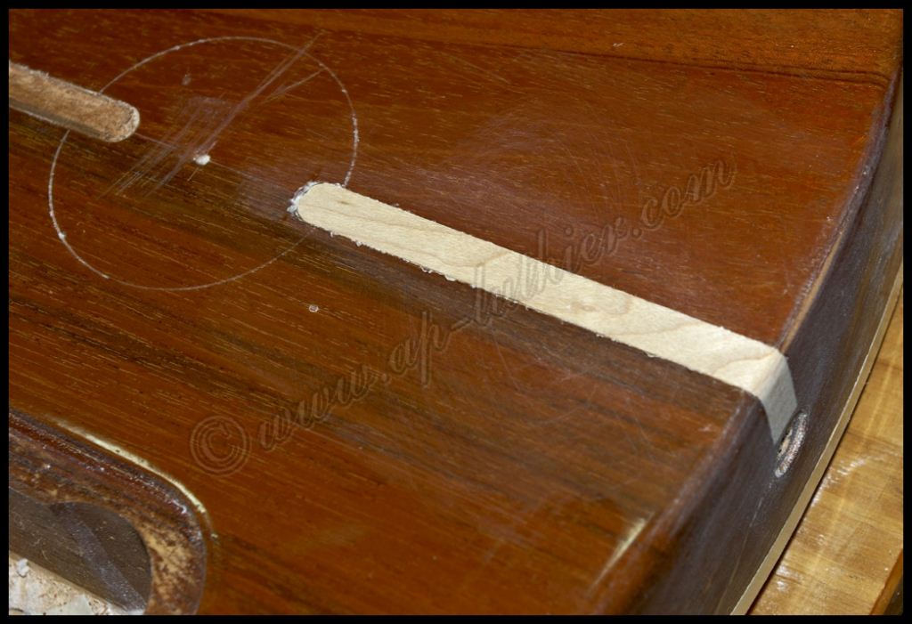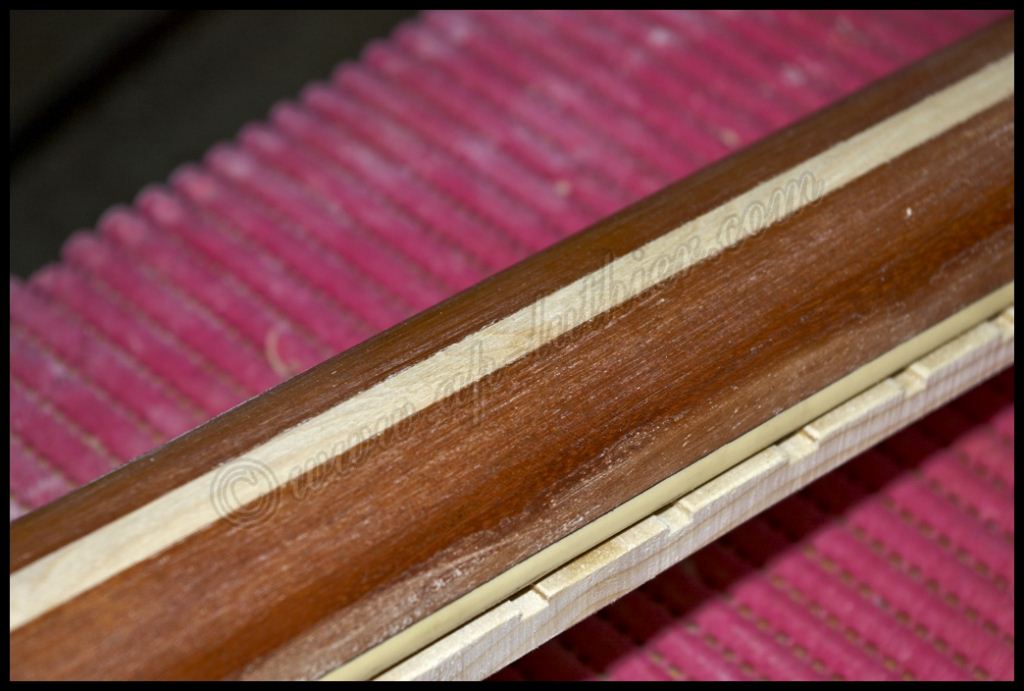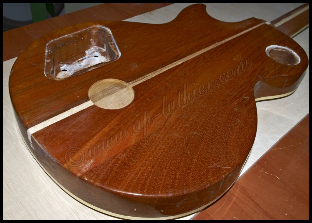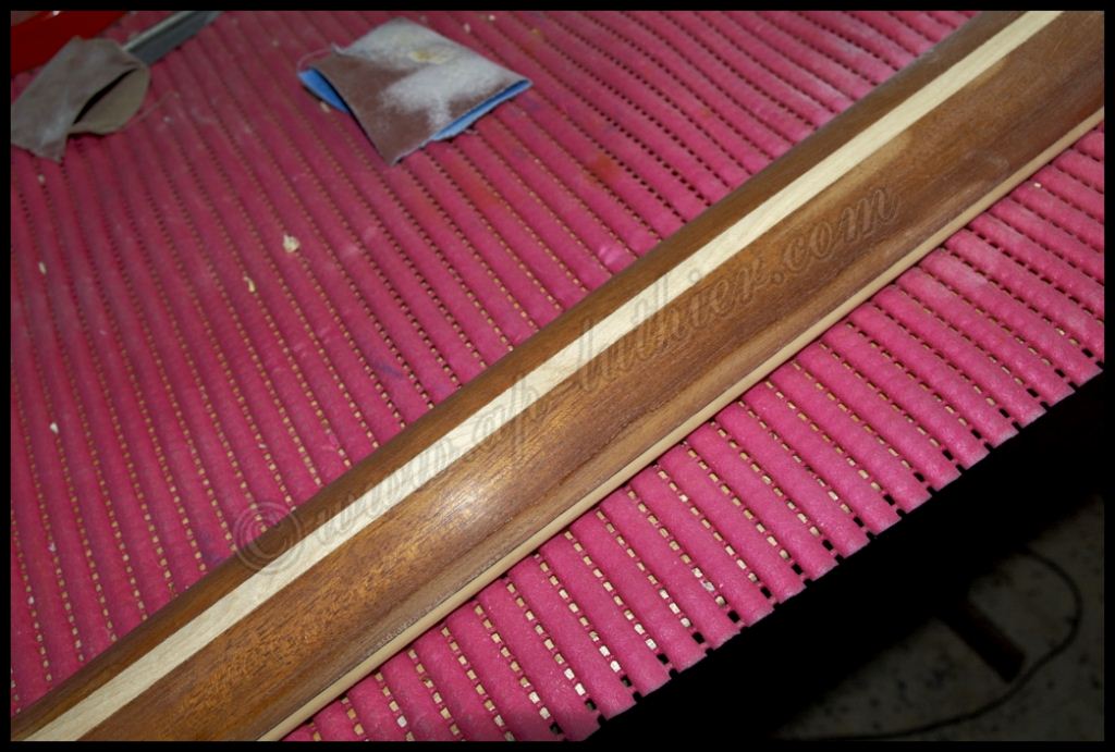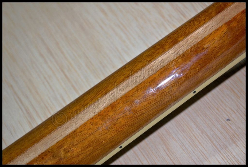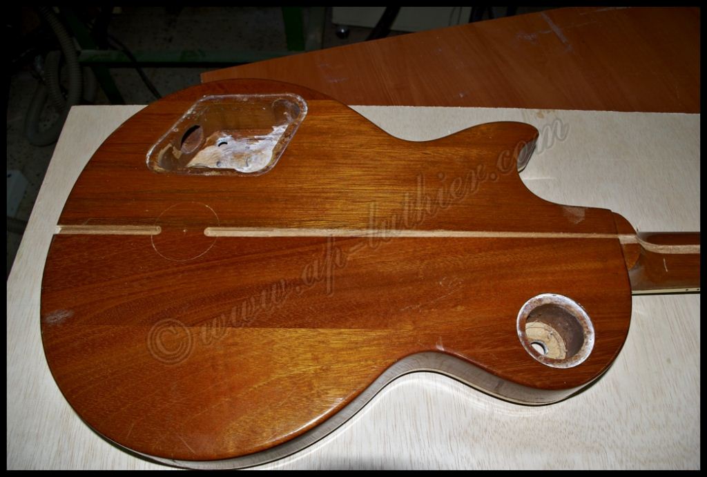 Old Black Neil Young Réplica Hay muchas historias al respecto, pero nadie sabe con certeza el porque. Solo se pueden sacar conjeturas basándose en hechos ocurridos en la época. Se supone que esta guitarra ha sufrido un accidente. Esta suposición se fundamenta en dos detalles. Una es la franja de arce que atraviesa el mástil, y la otra es la "Espiga de trigo" que hay colocada en la pala. Como todos saben, el modelo Les Paul sufrió un cambio drástico en el 61 por la caída de las ventas en este modelo, y decidieron renovar completamente el diseño de la misma. Hecho al que se opuso el propio Les Paul, el cual afirmaba que esa no era su guitarra. A pesar de que salieron algunos modelos con su firma estampada, Gibson tuvo que cambiar esta por la famosa espiga de trigo. En la foto de abajo una pala original de la época. También experimentaron con volutas y mástiles combinados de caoba con arce para intentar solucionar un problema de rotura en la pala ![]() de ahí la teoría de que la guitarra tuvo que sufrir un accidente por esas fechas y que tuvieron que cambiarle el mástil. Este hecho se reafirma porque todas las guitarras reparadas por esa época por Gibson, presentan la misma pala. Por eso lleva la espiga en vez de la tradicional firma, además como se verá mas adelante tiene otro detalle importante. Volviendo al mástil, algunos luthieres y fabricantes optaron por pintar la franja de atrás, ya que es mucho mas fácil y no todos poseen los medios para hacerla en condiciones a partir de un modelo ya terminado, pero en esta ocasión, tanto el dueño como un servidor, queremos que sea una copia lo mas fiel posible a la original, por lo tanto hay que trabajar un poquito mas. La solución es incrustarle una tira de arce, y para ello primero hay que realizar un canal. Para ello tuve que diseñar y construir herramientas especiales para este trabajo. ![]() Una vez hecho se puede apreciar un surco no muy profundo, para no llegar al alma, pero si lo suficiente para que esta tira ejerza su función estética y a la vez de refuerzo. ![]() Como se puede ver, el fresado es un poco complicado ya que no es lo mismo trabajar en maderas vírgenes y darles forma, que trabajar sobre un instrumento ya hecho en donde hay que adaptarse a las superficies irregulares ya hechas. ![]() Al final el surco desde la base del cuerpo hasta ![]() la pala ![]() Preparando el perfil de arce duro para ![]() darle forma térmicamente, ![]() Ver que todo cuadra sin problemas ![]() reajustar sus cotas ![]() y encolarlo, comenzando por la parte de la base ![]() y luego a lo largo del mástil ![]() Una vez emparejado la tira con la superficie curva del mástil, da un aspecto de un mástil compuesto. ![]() Detalle en la base del mismo. ![]() ![]() ![]() Curiosamente el surco no tiene arce en toda su extensión. Hay una parte en la que a parte de ser irregular, en la original si se fijan con detalle en las primeras fotos, está hueco. Otro misterio que aclarar. ![]() Luego realicé el famoso orificio, que nadie sabe para que fue realizado. Nadie sabe lo que hay debajo de esa tapa. Hay muchas especulaciones que si el cuerpo también sufrió con el accidente y tuvo que ser reforzado en esa zona, que si es un acceso para ajustar el puente, (Cosa poco probable ya que está mas arriba, en todo caso coincide con el Bigsby), sin embargo personalmente creo que la explicación es mucho mas sencilla y como cosa rara no lo he leído por ahí. Es tan sencillo como que quizás originalmente se le comenzó a instalar o inclusive que se le fuese instalado el micro interruptor que hay entre los potenciómetros, en ese lugar, y que al darse cuenta del Bigsby o cuando se lo pusieron, ya que no se sabe que fue primero, tuviesen que reubicarlo en la posición que se encuentra en la actualidad. el caso es que solo nos interesa la apariencia, y es suficiente con realizar un alojamiento para colocarle una tapa como la del selector. ![]() Un par de vistas de como está quedando el mueble tanto en la parte de atrás ![]() como en la parte delantera ![]() Otra modificación significativa es en la pala. No se sabe si originalmente se le arrancó el binding a una pala con ella, o si bien le hicieron el surco para colocarla posteriormente. El caso es que en la original este surco está ahí. Pues bien habrá que hacérselo a la copia ![]() ![]() Sin embargo he aquí una de las cosas que sorprenden de un fabricante de renombre. Uno espera encontrarse madera, pero en este caso me encontré con una lámina de metacrilato. Con razón, lijé previamente el logotipo de la firma, y no se iba, pensaba que era una serigrafía bastante profunda que luego sacaría lijando un poco mas como en otros modelos, pero ahora me doy de cuenta que es metacrilato de color dorado incrustado en el negro. Como idea magnífica, pero para un instrumento no tanto. Las roturas en este material son estallidos, y un golpe o grieta es mucho mas difícil de reparar. ![]() Una lámina de 1/16 de pulgada recubre esta zona, que tendré que quitar también ya que para darle el efecto envejecido a la pala es imposible. El plástico no se gasta, ni rompe, ni queda como la madera, haciendo imposible darle el mismo efecto, a menos que se maquille con pigmentos, pero este no es el caso. ![]() Página Anterior Página Siguiente |