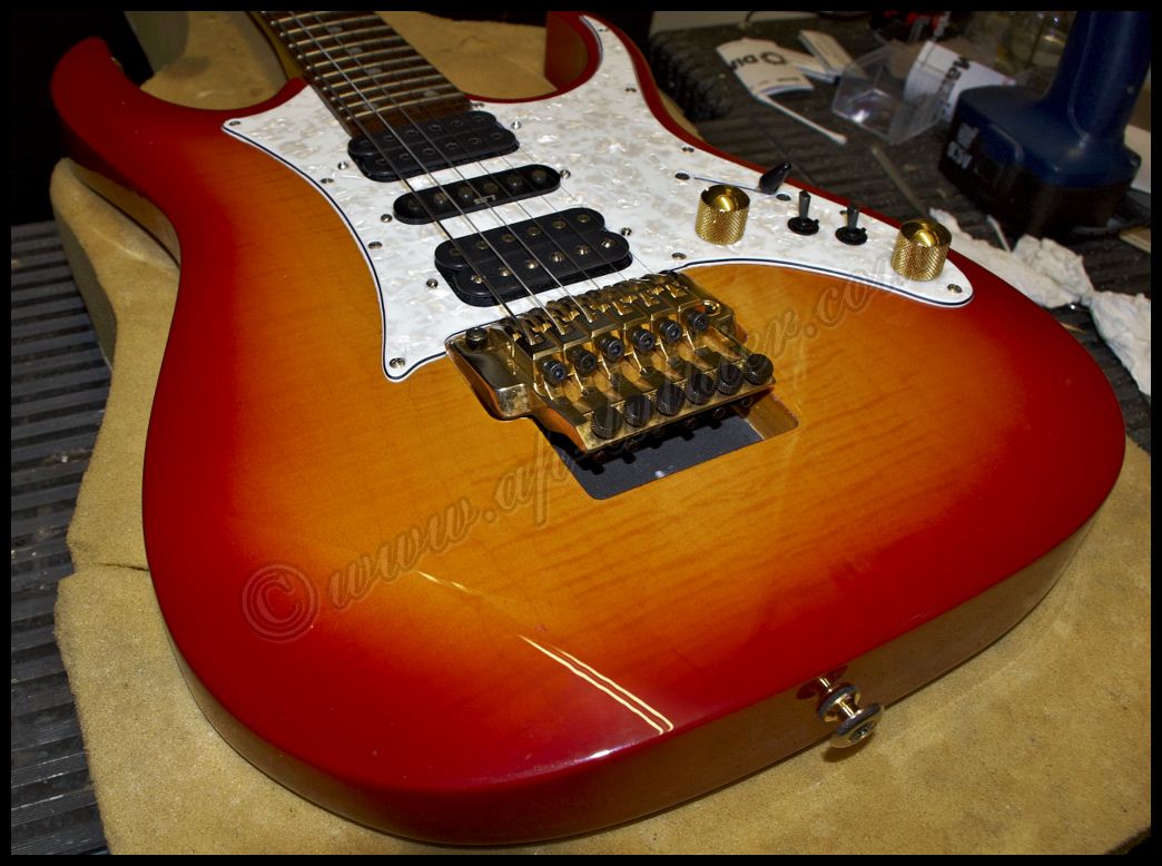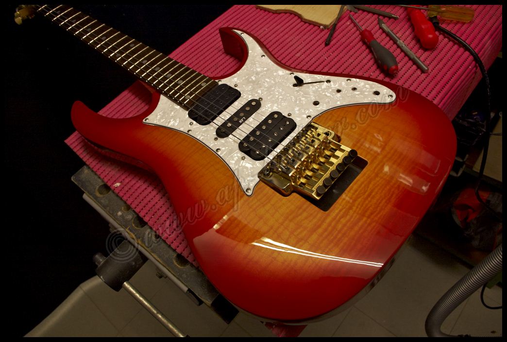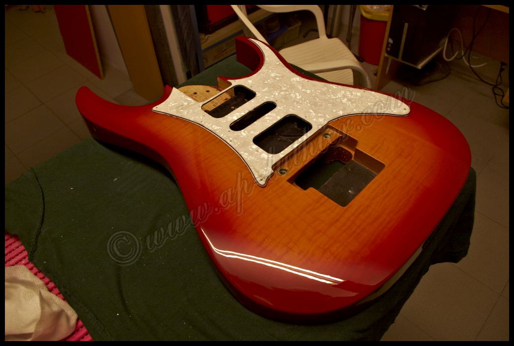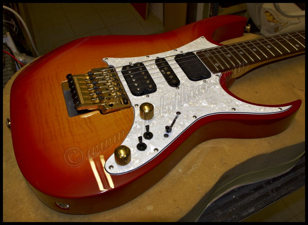 Conversión de una Ibanez RG 570 Ni rastro de los golpes y esta combinación de colores, le da a la guitarra una nueva vida ![]() Las mejoras no solo se efectuaron a nivel del cuerpo y mástil, si no que la electrónica también fue personalizada con lo que son para mi las mejores pickups para este modelo. Yo poseo el mismo modelo desde hace muchos años y experimentando he llegado a la conclusión de que las pastillas Dimarzio PafPro para el mástil y la Tone Zone para el puente, son las ideales para este instrumento. La pastilla central, es bastante buena y por eso recomiendo dejarla. Aquí ya se puede ver con el diseño del golpeador y sus pastillas. ![]() Con todo en marcha pues ahora viene el acabado final ![]() Pulido ![]() Y lista para armarla de nuevo ![]() ![]() ![]() Al ser los cables de las pastillas mas gruesos tuve que hacer un canal para introducir los mismos. ![]() Y aquí probando y cuadrando en su sitio los elementos con su nuevo look ![]() y aquí ya terminé de montarla. Como pueden observar le he montado dos micro switches ON-ON-ON. Esto casi siempre que me lo permiten se lo hago a este tipo de guitarras. Da una versatilidad excelente y se obtienen 13 sonidos dándole muchas posibilidades al instrumento, ya que se pueden variar las humbuckers dependiendo de la posición en serie que es el sonido normal, coil tap que sería convertirla en sencilla y así tenemos los sonídos típicos de la Strato, y en paralelo. Este último permite usar esos sonidos tipo vintage de las guitarras añejas. ![]() También le he montado el sistema del TremoloSi, con lo que la guitarra ya queda completa. ![]() ![]() ![]() ![]() ![]() ![]() Y al final teneis el vídeo con su feliz dueño y observen y sobre todo oigan la diferencia en sonido, sustain y resonancia de la guitarra Un saludo a Todo@s Pagina anterior |
